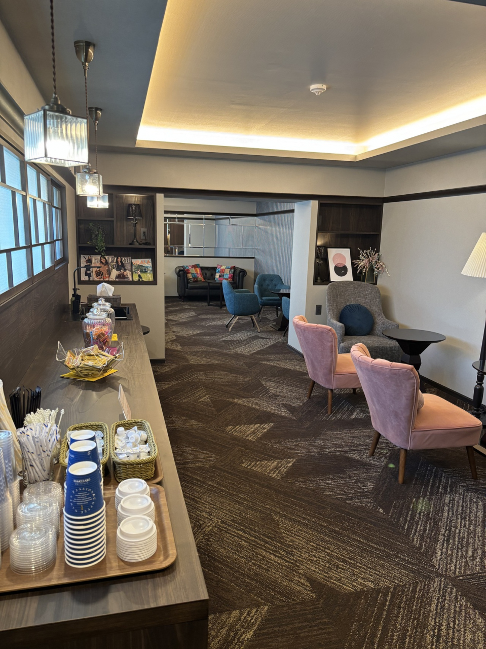 ラウンジは2つあって、どちらもアルコールやナッツなどのおつまみやフルーツ、静岡のお茶がいただけます。