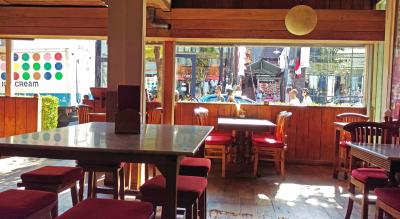 入り口右手の、喫茶もつい利用したくなる大正ロマン的な雰囲気。天気がよければテラスもいいと思います。