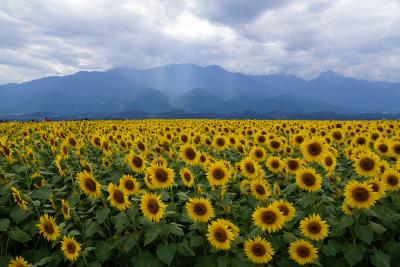 北杜市明野にあるひまわり畑です。南アルプスの山々を背景にひまわりが咲いていて、非常に良い景色が見られる場所です。