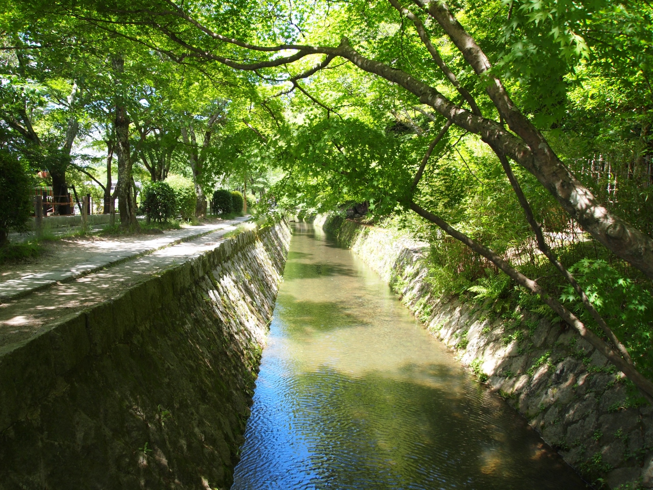 京都市の東側、東山の麓の琵琶湖疎水分線に沿ってある小路です。南は熊野若王子神社から北は銀閣寺まで続いています。春は桜、秋は紅葉で有名ですが、新緑の緑も大変美しく、観光客もあまり多くないので、ゆっくり散歩できます。疎水の水は非常に綺麗で、新緑が映り込んですばらしい散歩道だと思います。