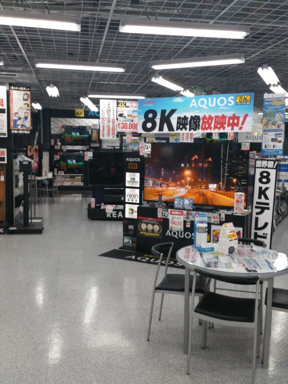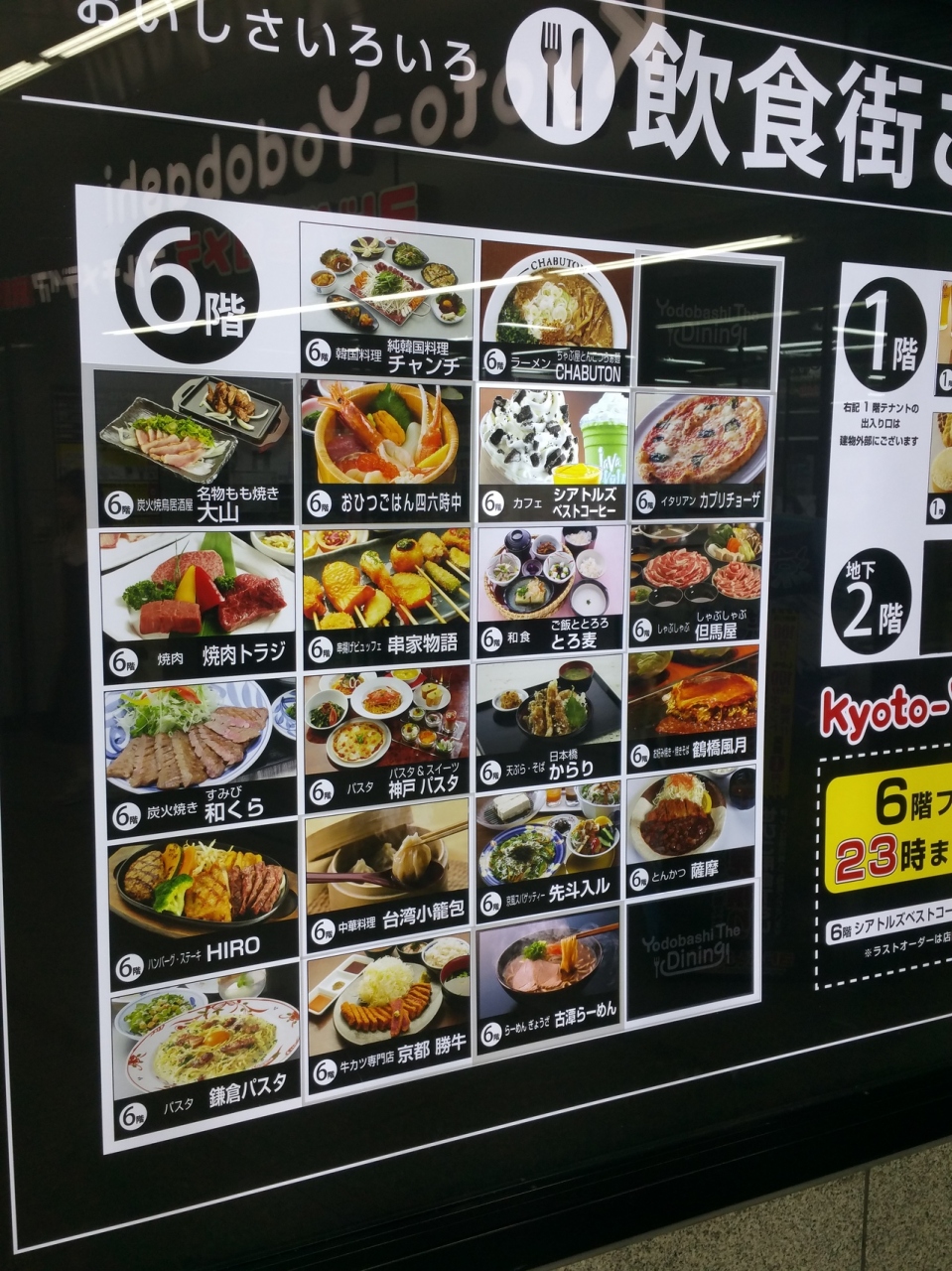 京都駅北口にあるヨドバシカメラ。駅から少し歩きますが、地下道で繋がっているので便利です。地下一階から四階までが、ヨドバシの家電販売フロアで、6階には夜遅くまでやっているレストラン街が入っているので、家電の買い物だけではなく、食事にも使えて便利です。