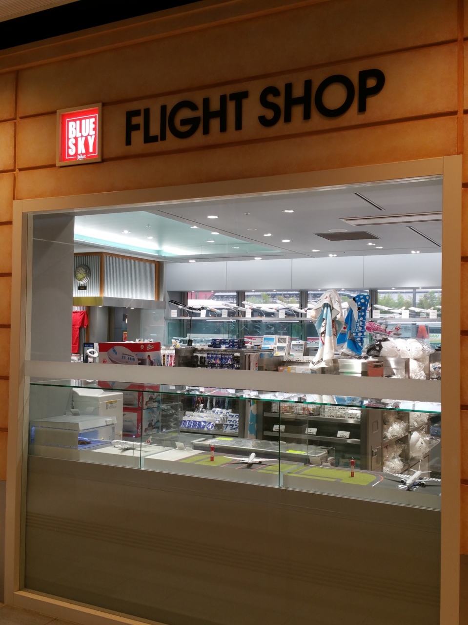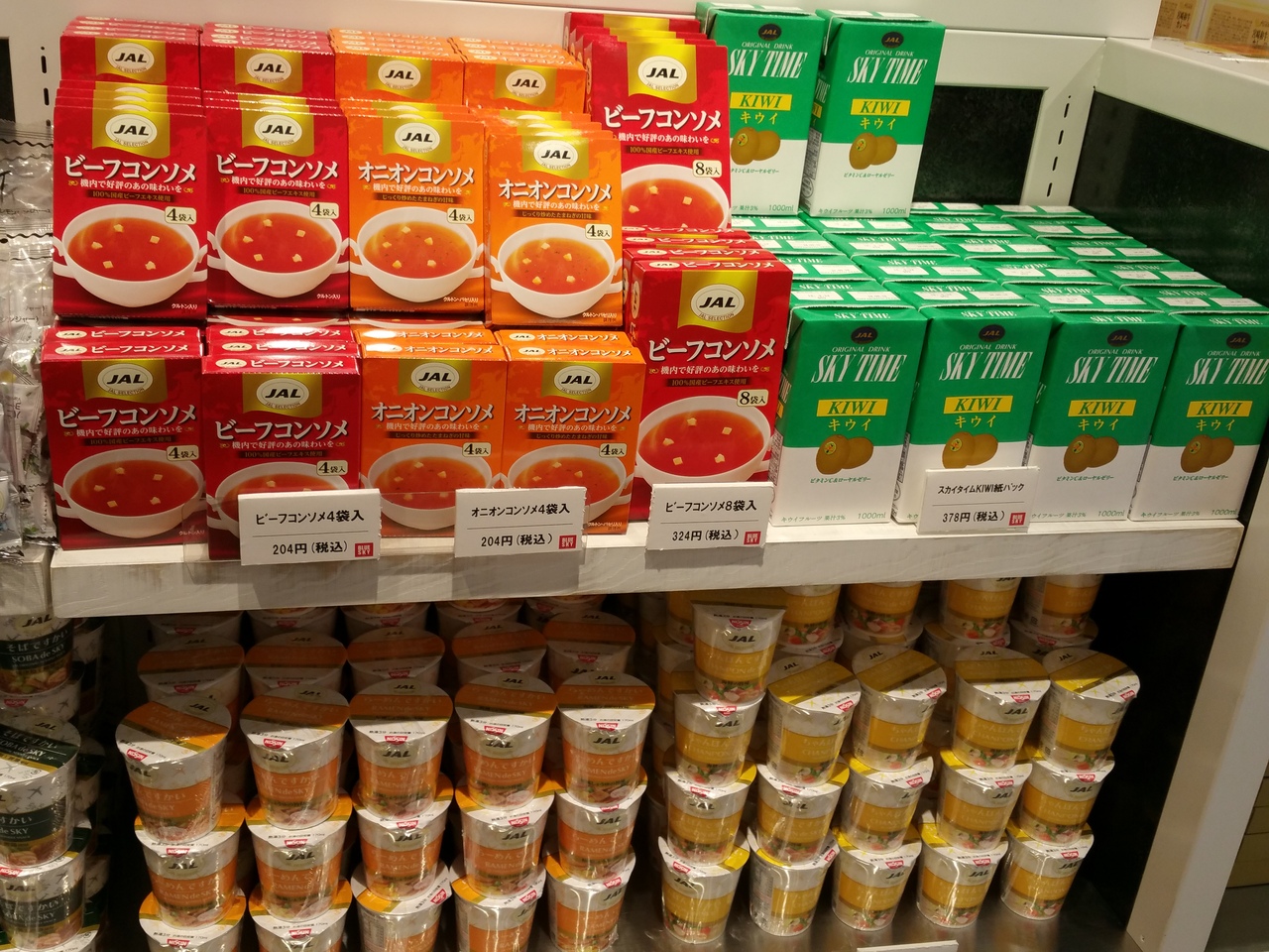 羽田空港には、あちこちにブルースカイショップがありますが、こちらは到着ロビー1階バスターミナルのあるフロアのブルースカイショップです。フライトショップとして、他のブルースカイと分けていて、JALの小物や飛行機の模型なども置いてあります。注目は機内で食べられる、カップ麺やスープ類、スカイタイムなどお馴染みのものを買うことができます。