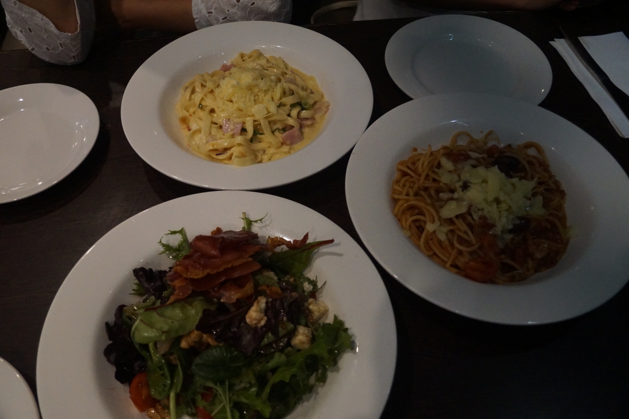 パスタ2種類(ナポリ、カルボナーラ)、サラミサラダを