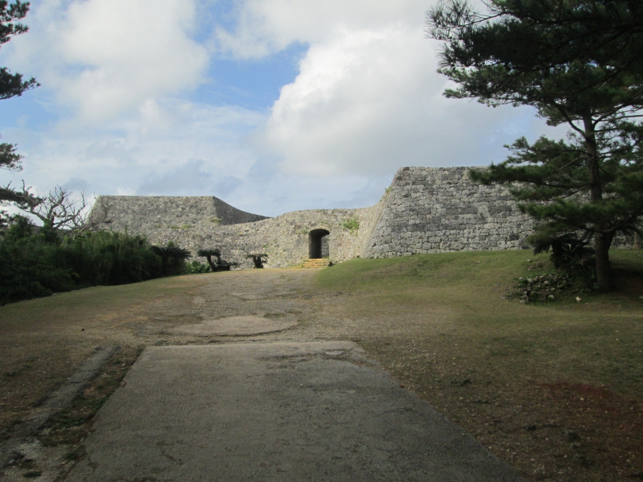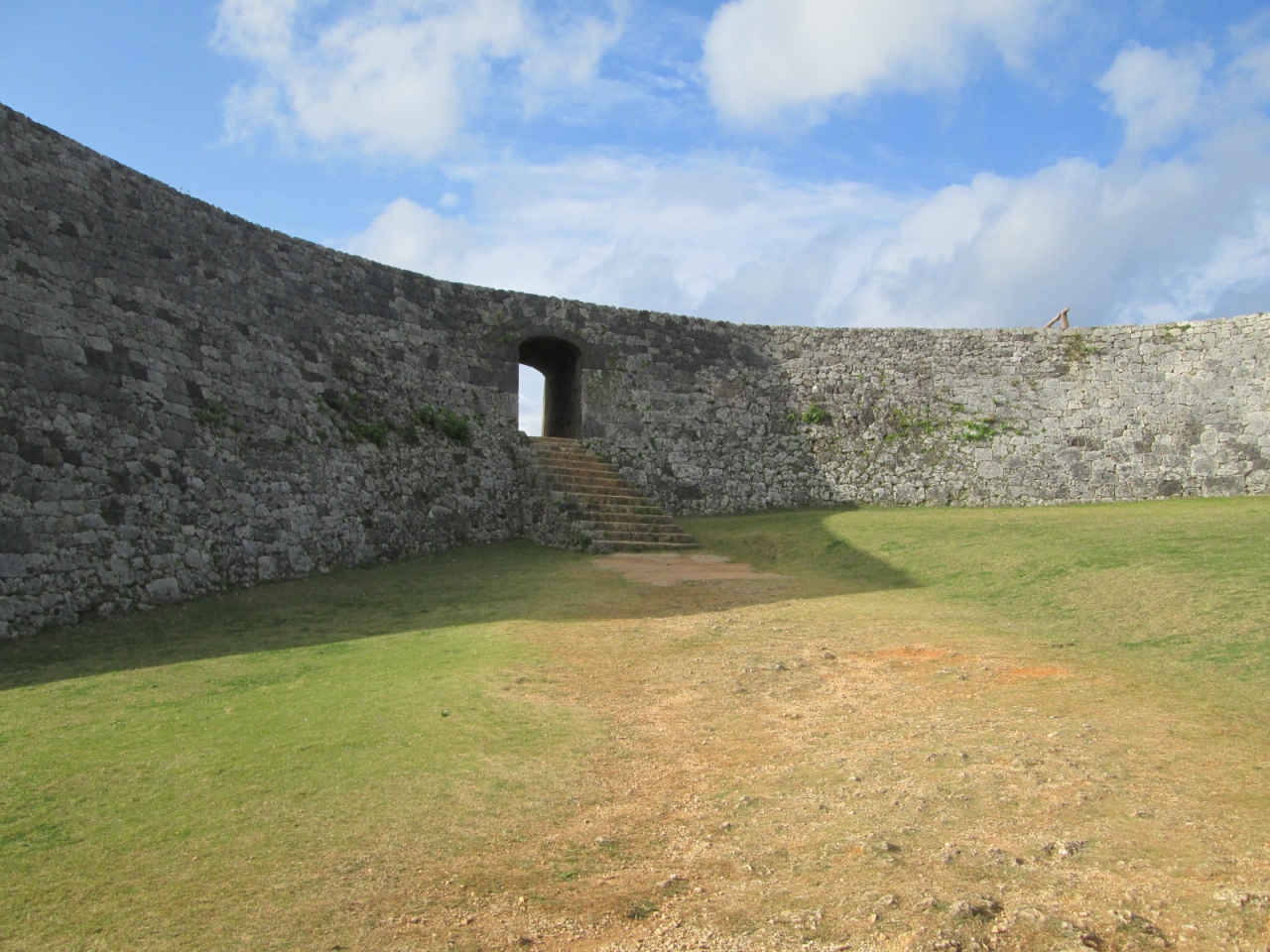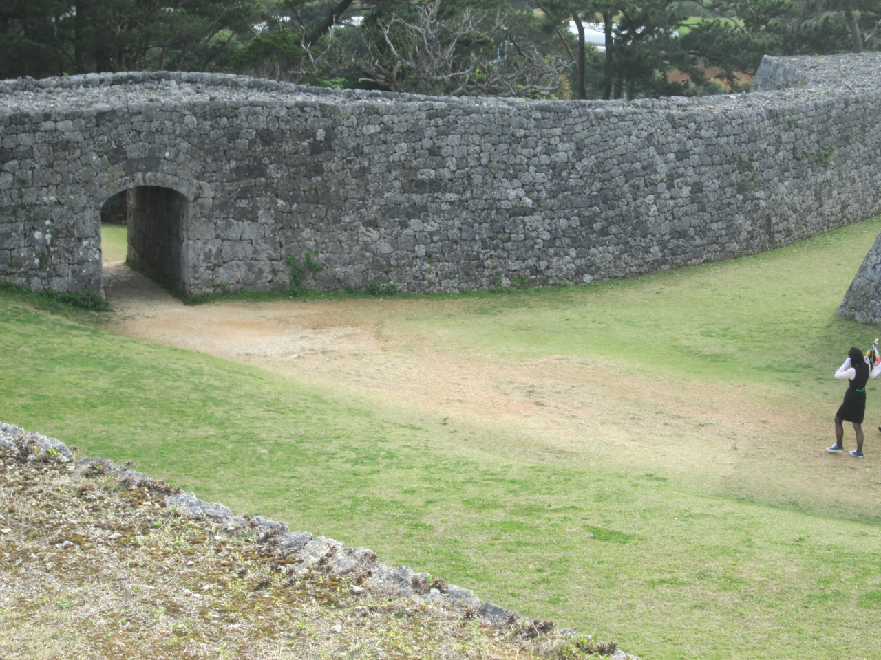 琉球王国が日本、中国、東南アジア諸国との交易で繁栄した14世紀初頭に読谷山の按司護佐丸(ごさまる)が築城したとされ、二つの郭で構成される城壁には、楔石を用いたアーチの石門が造られ、重厚で美しい曲線が生かされているのが特徴とか。