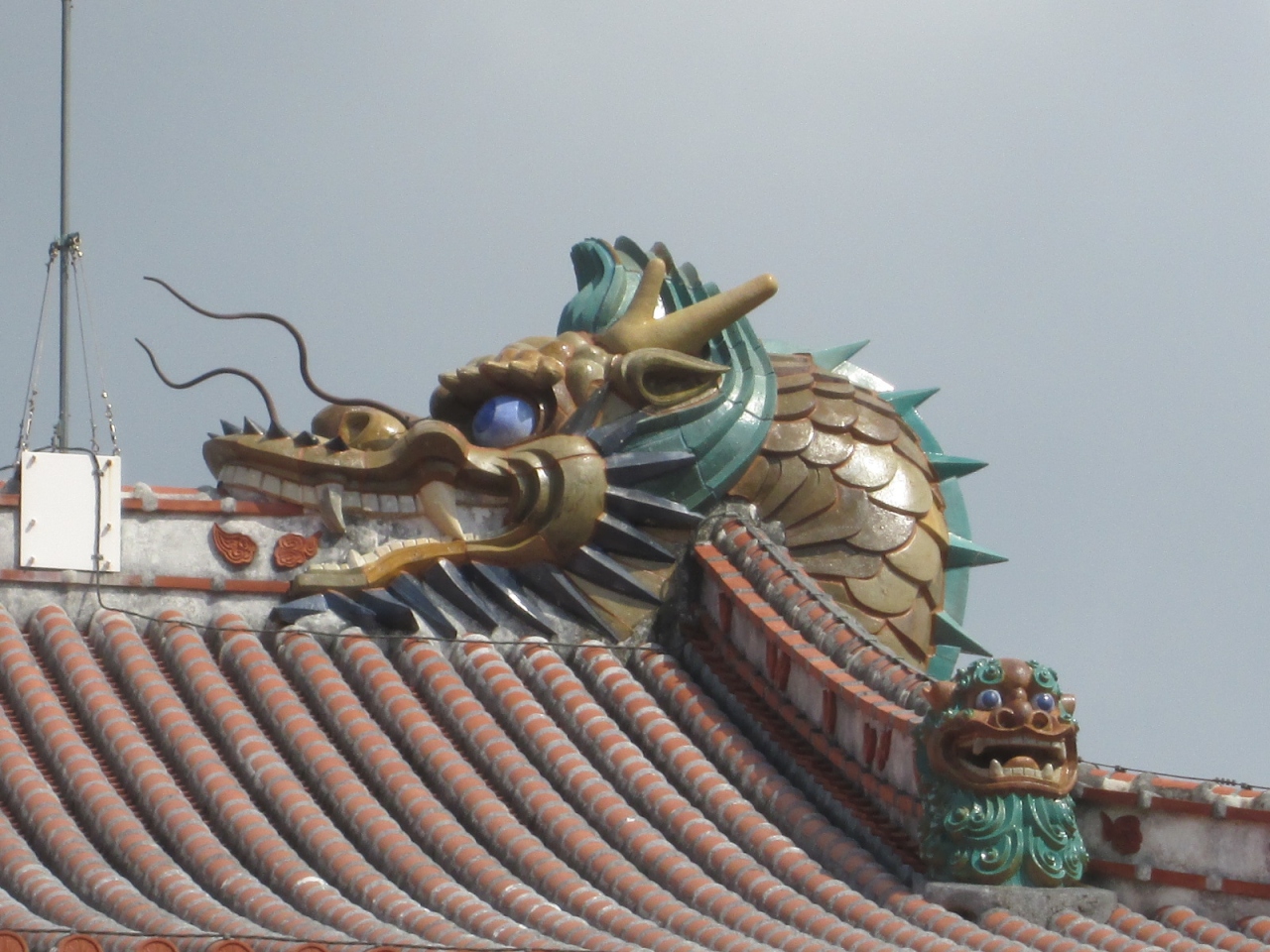首里城で最も中心的な正殿は、2層3階建てで装飾化した龍柱は日本中に例がなく、琉球独自の形式で、壁等の彩色塗装には桐油が塗られ、正面石階段の両脇の大龍柱(だいりゅうちゅう)という龍の彫刻、手すりの奥にはもう小龍柱(しょうりゅうちゅう)があるほか柱や梁(はり)等にも国王の象徴であるという龍の彫刻が多数施されています。