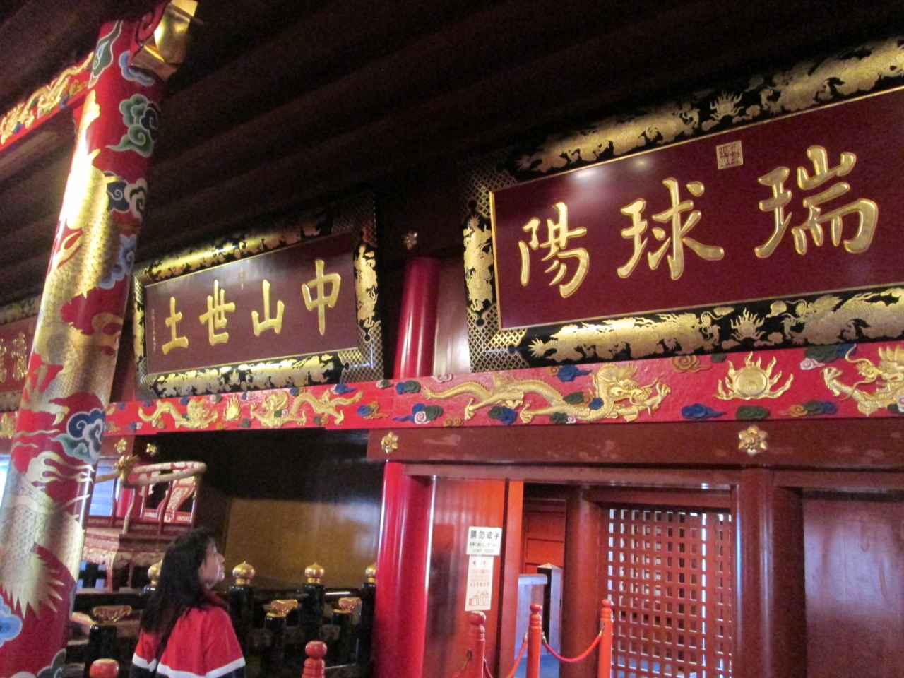 中央の扁額「中山世土(ちゅうざんせいど)」は、中国の康熙帝が贈ったもの、右側の「輯瑞球陽」(しゅうずいきゅうよう)は、雍正帝が贈ったもの、左側の「永祚瀛壖」(えいそえいぜん)は、乾隆帝の贈ったもので、いずれも復元されたものとのこと。