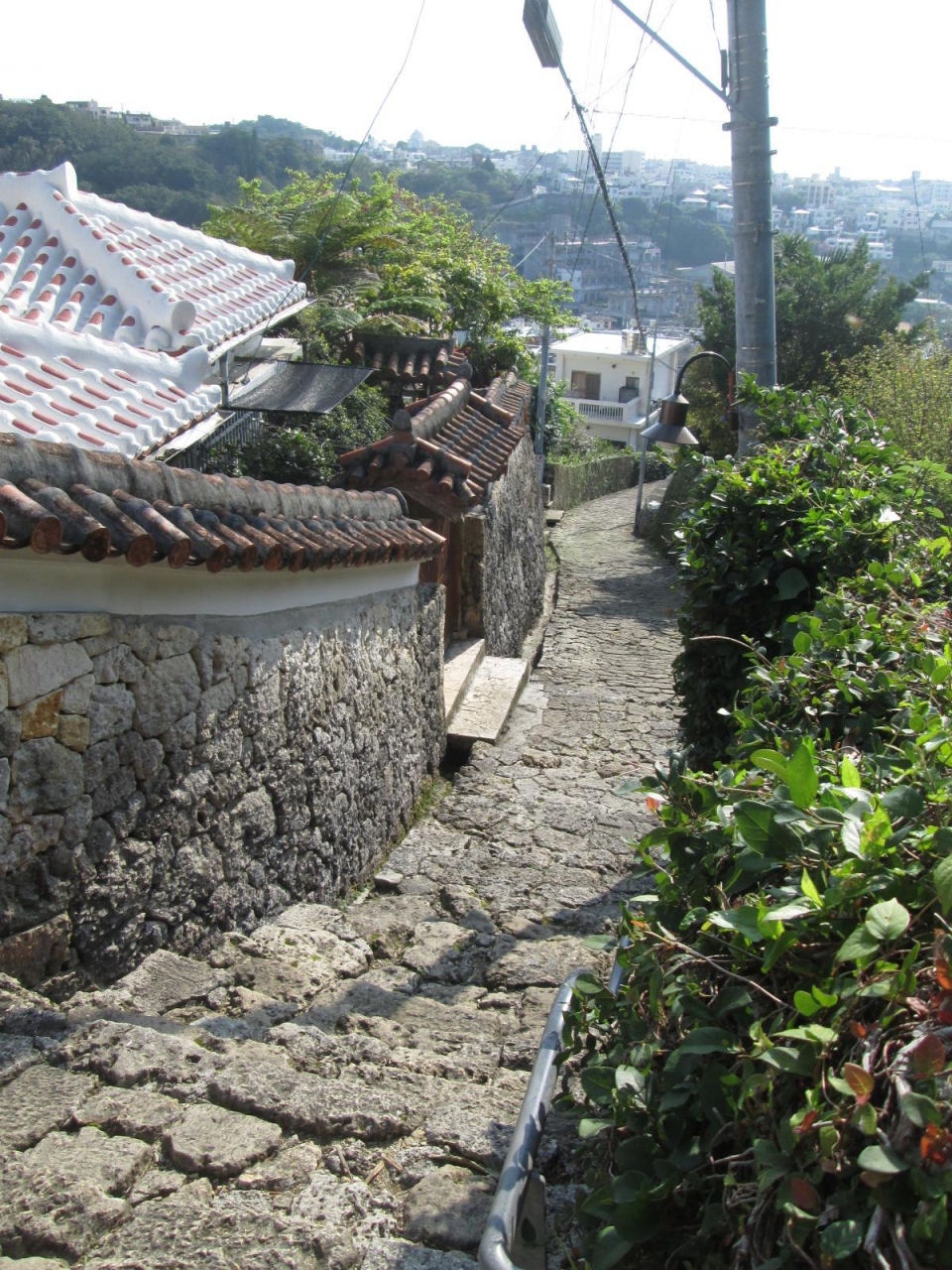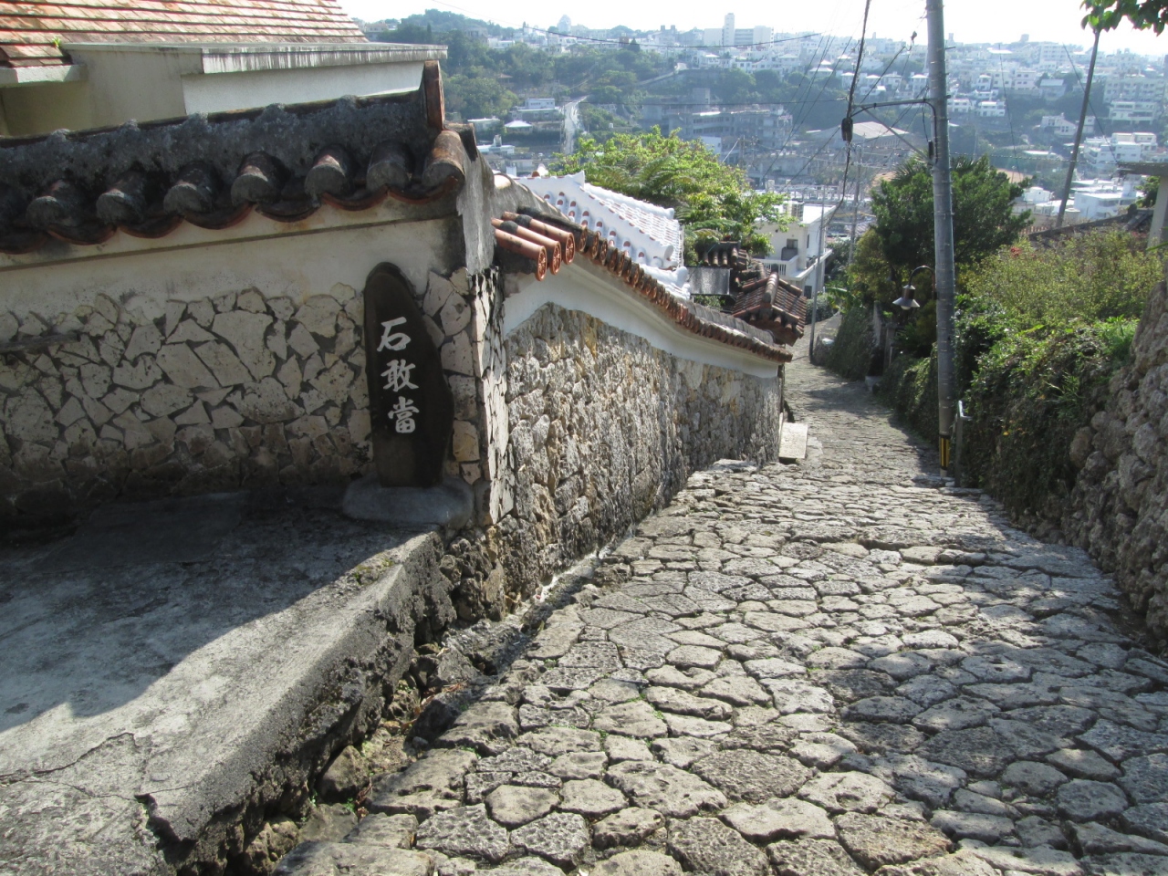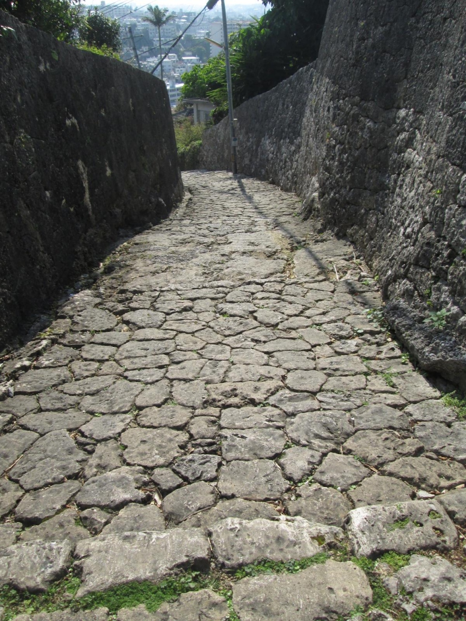ここは15世紀前半、第3代尚真王時代から造られた琉球石灰岩が敷かれた石畳道で、旧首里城守礼門南脇にあった石門(いしじょう) を起点に、識名(しきな)、国場(こくば)、真玉橋(まだんばし)を経て那覇港へ通じる総延長10kmの真珠道(まだまみち)と呼ばれた主要道路の一部だそうです。
