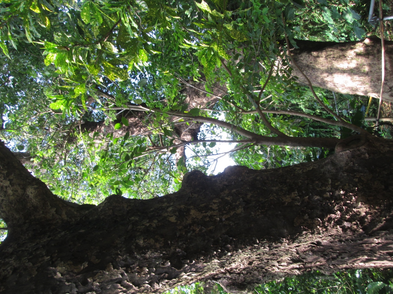 大きなアカギは東西合わせて6本生え、中でも広場を背に一番奥に生えている推定樹齢300年の巨木が神木とされ、神が降りて願いを聞いてくれるという大アカギ。