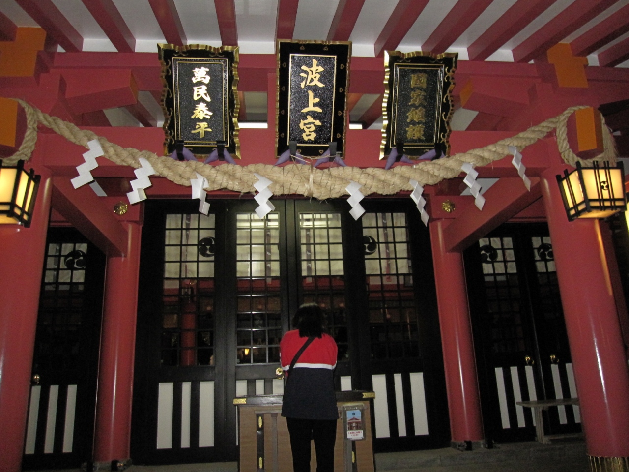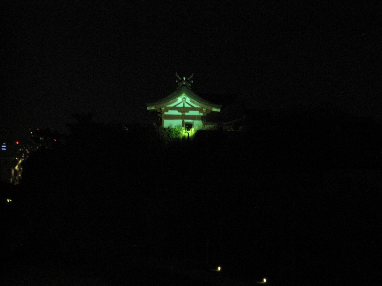 ホテルにチェックイン後、日中に参拝を予定でした波上宮がライトアップされていることを聞き出掛けたところ、境内は夜間でも出入り自由で、参拝後に波之上臨港道路から眺めてみるとその名の通り、海を見渡す崖の上に立っていました。