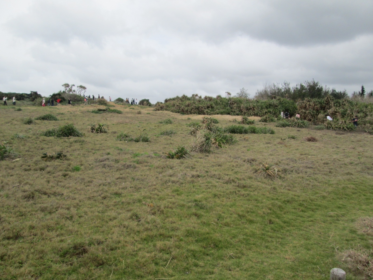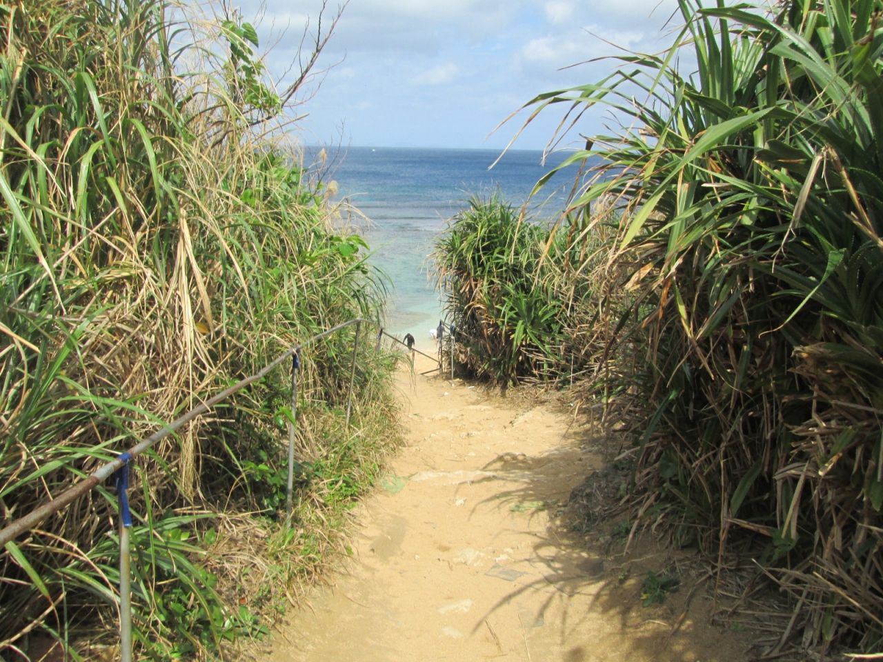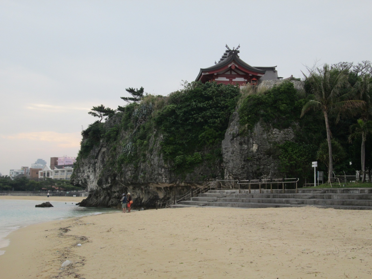 3日後の朝、再度参拝に出掛けたところ、夜は閉まっていた神社の西側外のフェンスが開いており、多分ビーチに通じると思って奥へ進んでみたところ、ズバリ、ビーチの崖の上の波上宮を見ることが出来ました。