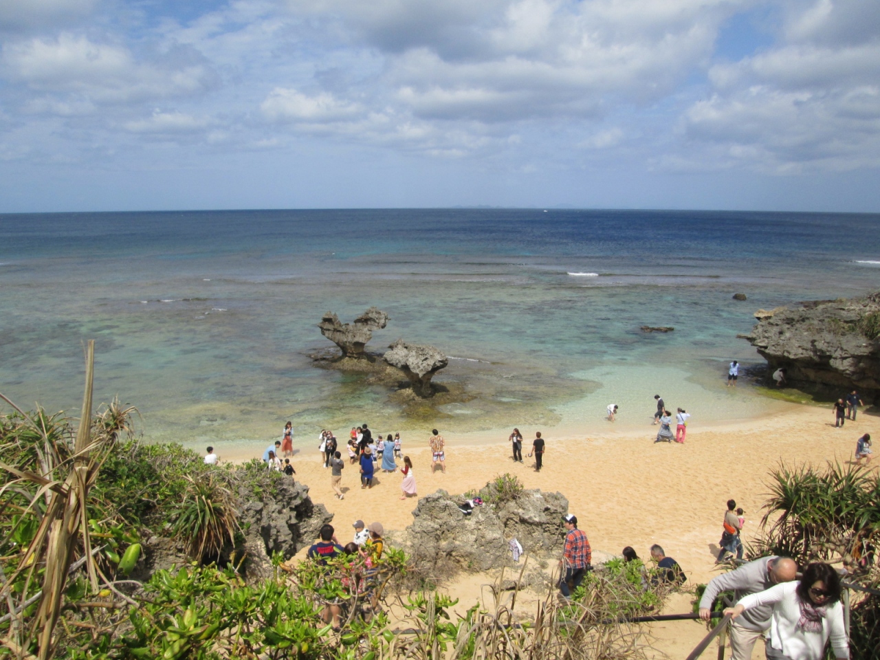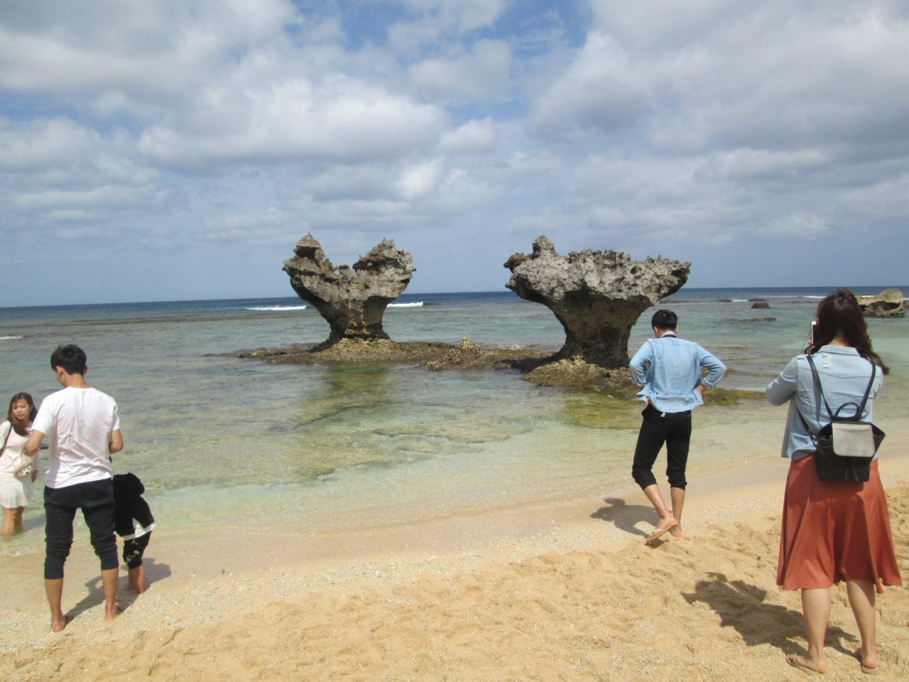 JALのコマーシャルで「嵐」が訪れて話題となった2つの岩がハートのように見えるハートロックは古宇利島(こうりじま)内北部のテイーヌ浜にあります。