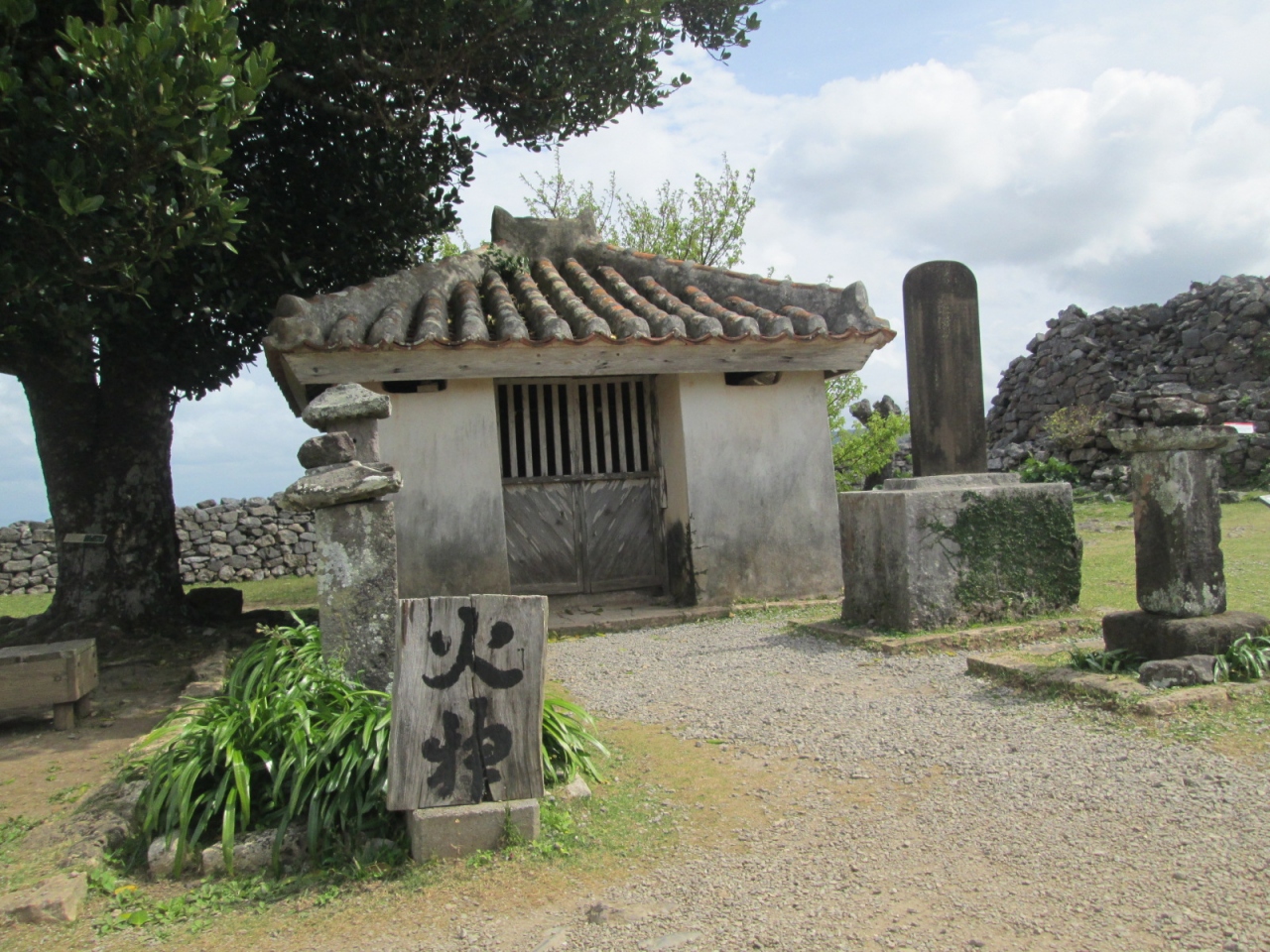 広場のようなスペースが境内で、小道を挟んで西と東にまたがっていて、それぞれに拝所があり、一方の一面は崖になり、その崖の穴には鬼になった兄を妹が餅を使って退治するという沖縄民話「鬼餅(ムーチー)」の主人公の兄妹が住んでいたとのこと。