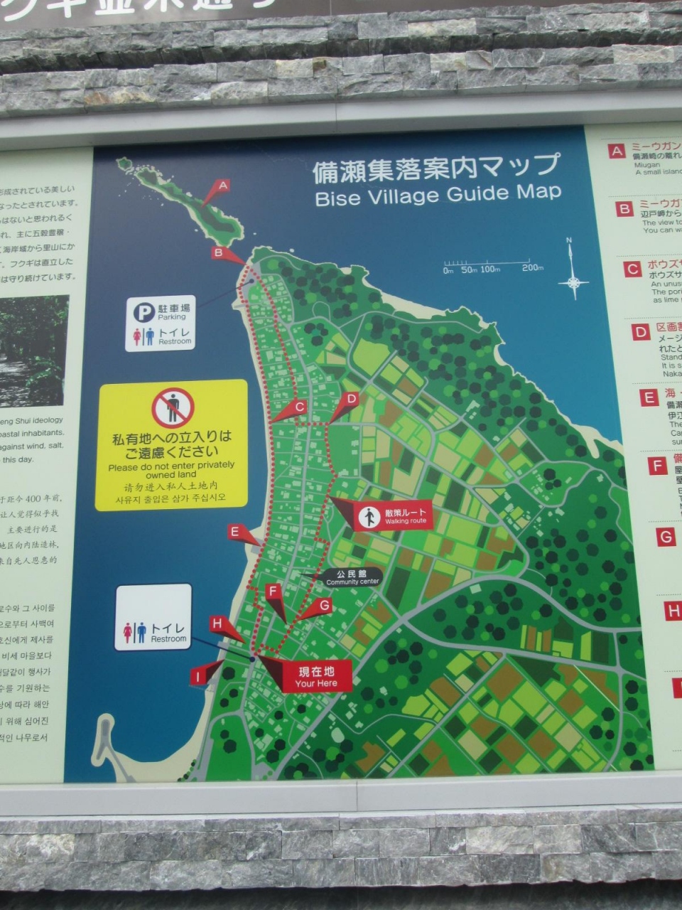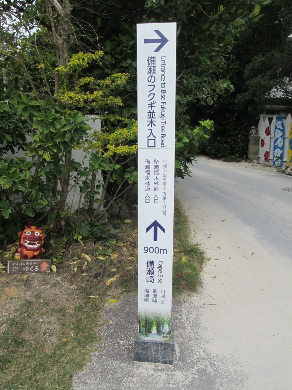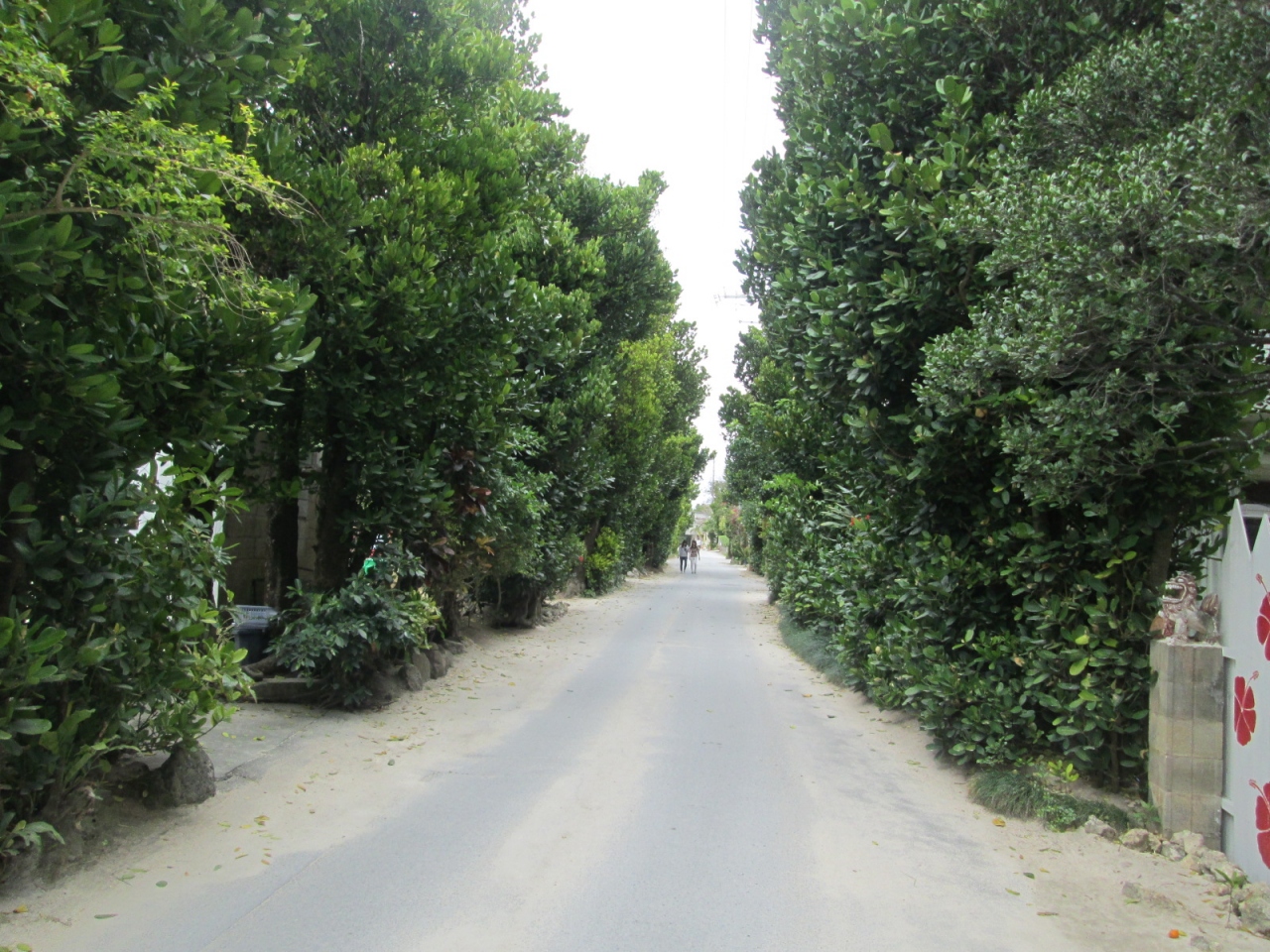 フクギの並木道がある備瀬地区は、碁盤の目のように区画した村落で、約250戸ある住宅のほとんどは繁茂したフクギの屋敷林に囲まれ台風の多い沖縄ならではの風景。