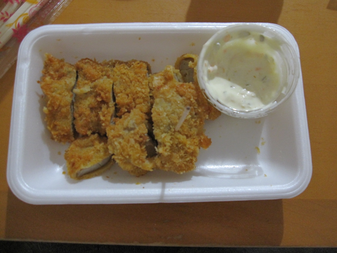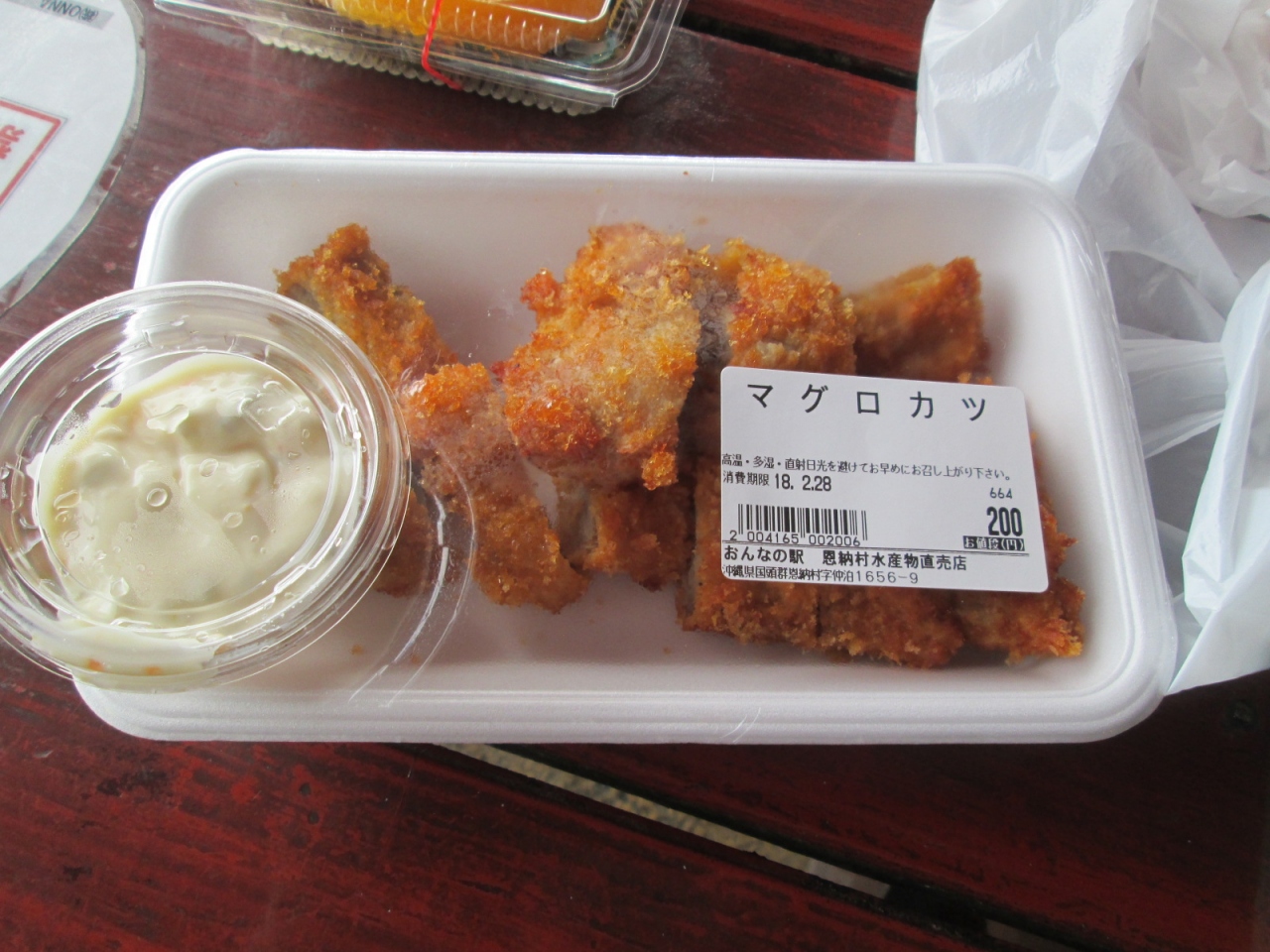 ここの恩納村水産物直売所で「ムール貝うにソース」1個120円と「マグロカツ」1パック200円が気にかかり、購入して食べてみました。茹でたムール貝にのせられたうにソースが濃厚で、とても美味しかったです。