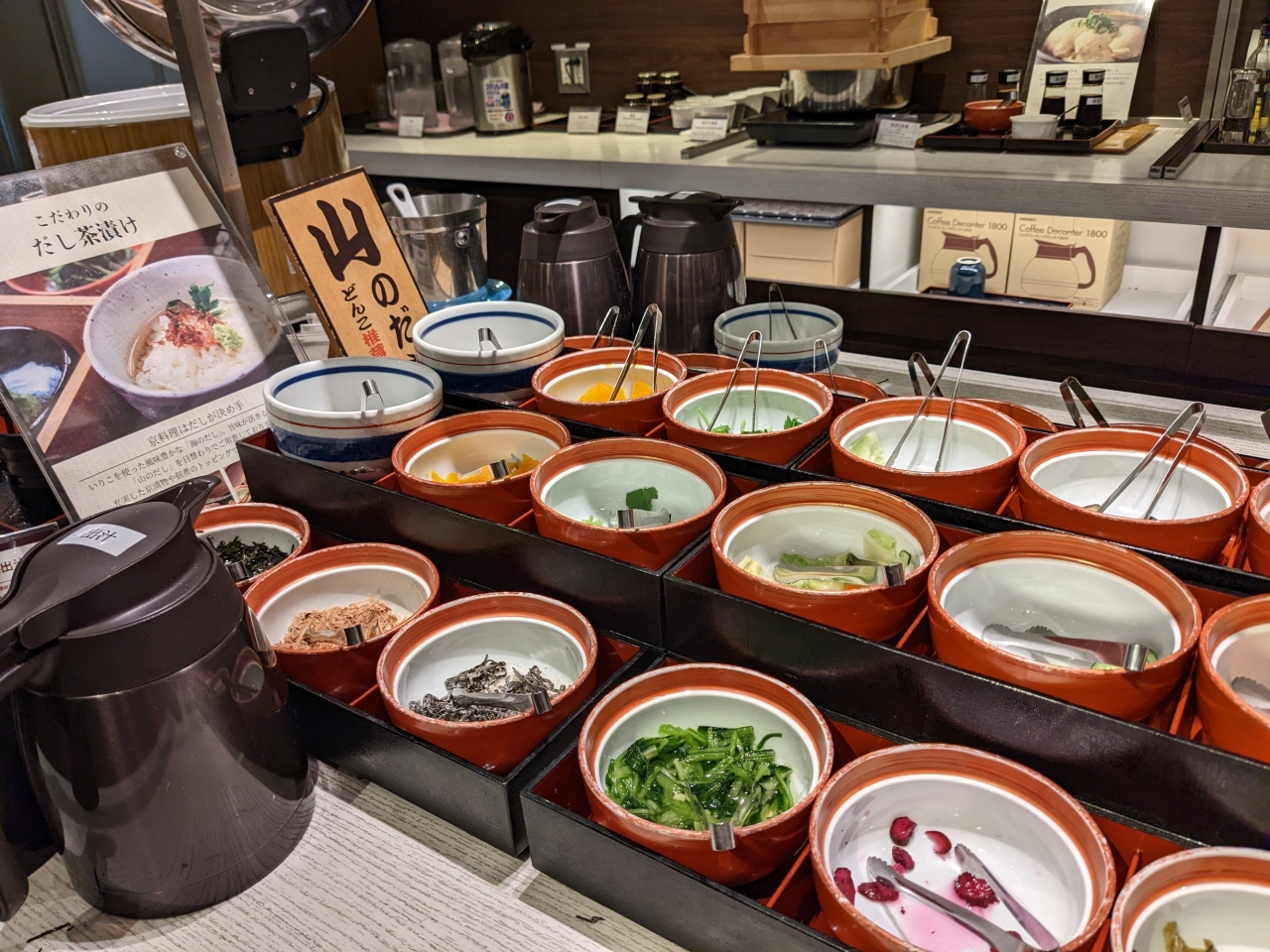 ホテル1階の「京都ダイニング御倉」の朝食ビュッフェは、品数も多く、どれを食べても美味しかったのですが、特に「だし茶漬け」が気に入りました。