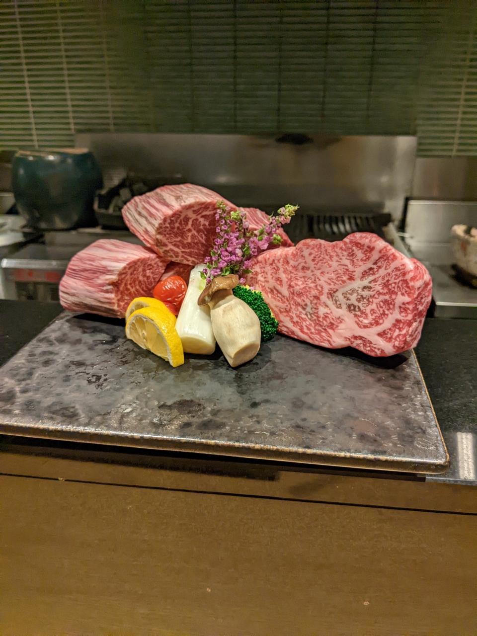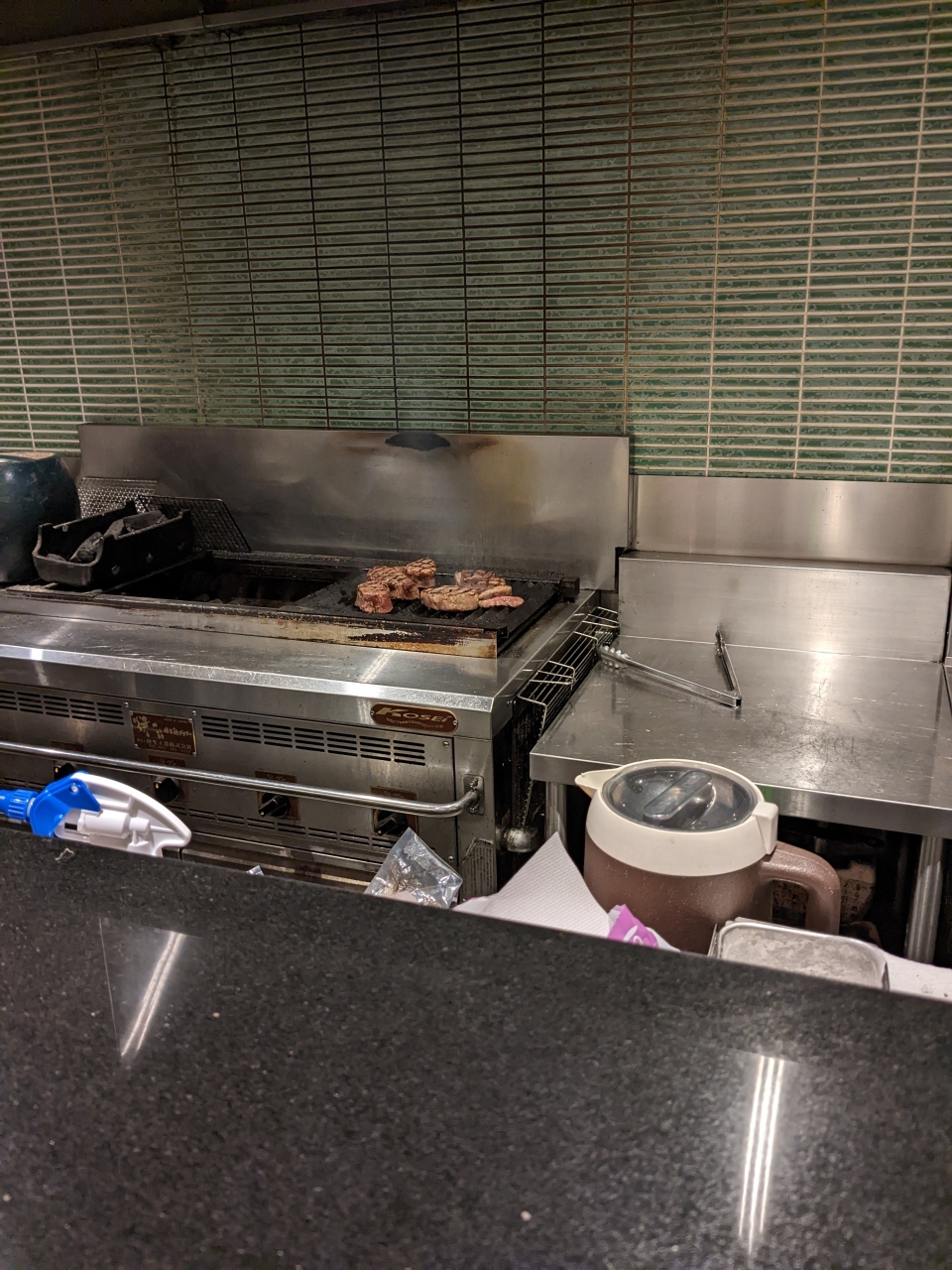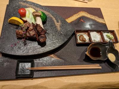 店内に入ると直ぐに霜降りのブロック肉が陳列されたケースが目に飛び込み、メニューを開くのが怖くなりましたが、久しぶりの旅行で、全国旅行支援のクーポンも頂いているので、まぁ良いかと思いコース料理を奮発しました。