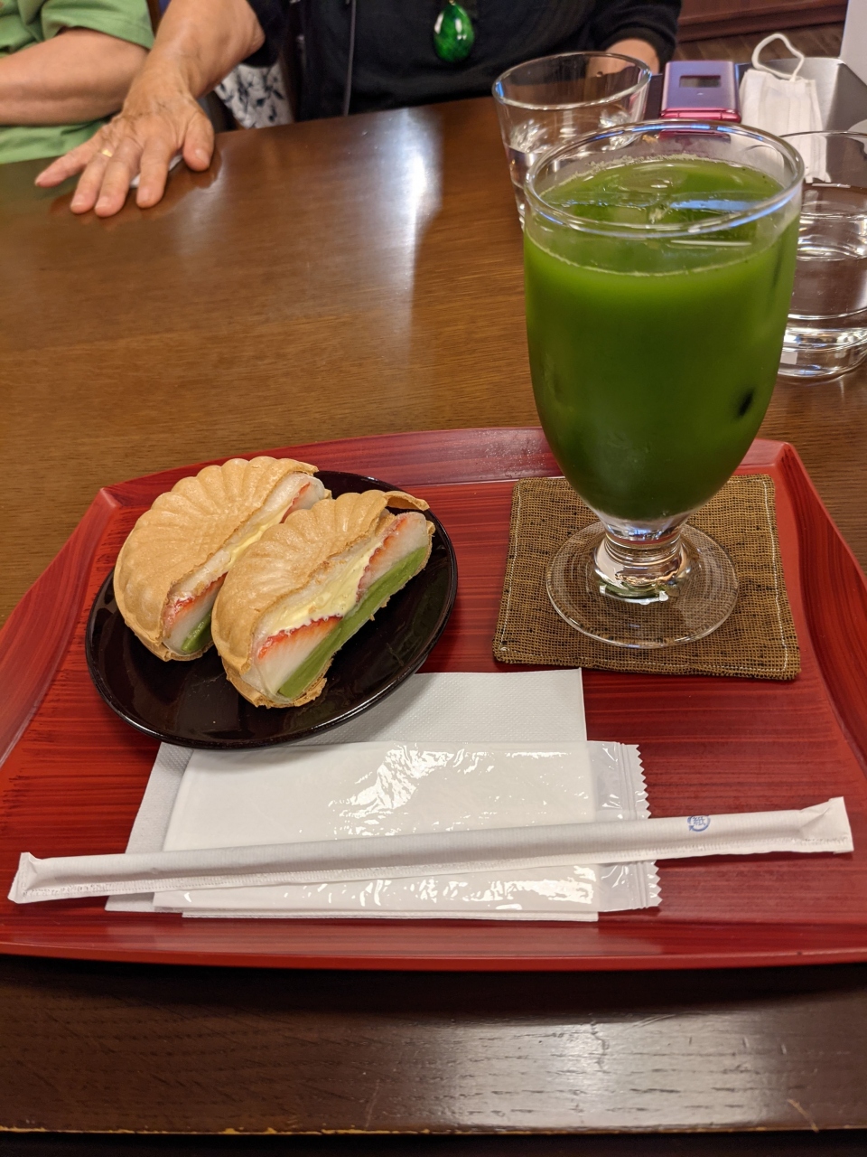 もなかの皮はパリパリで、餡は抹茶と生クリームに羽二重餅の様なものとフルーツが入っていて、セットの選択できるドリンクは互いにグリーンティにしました。