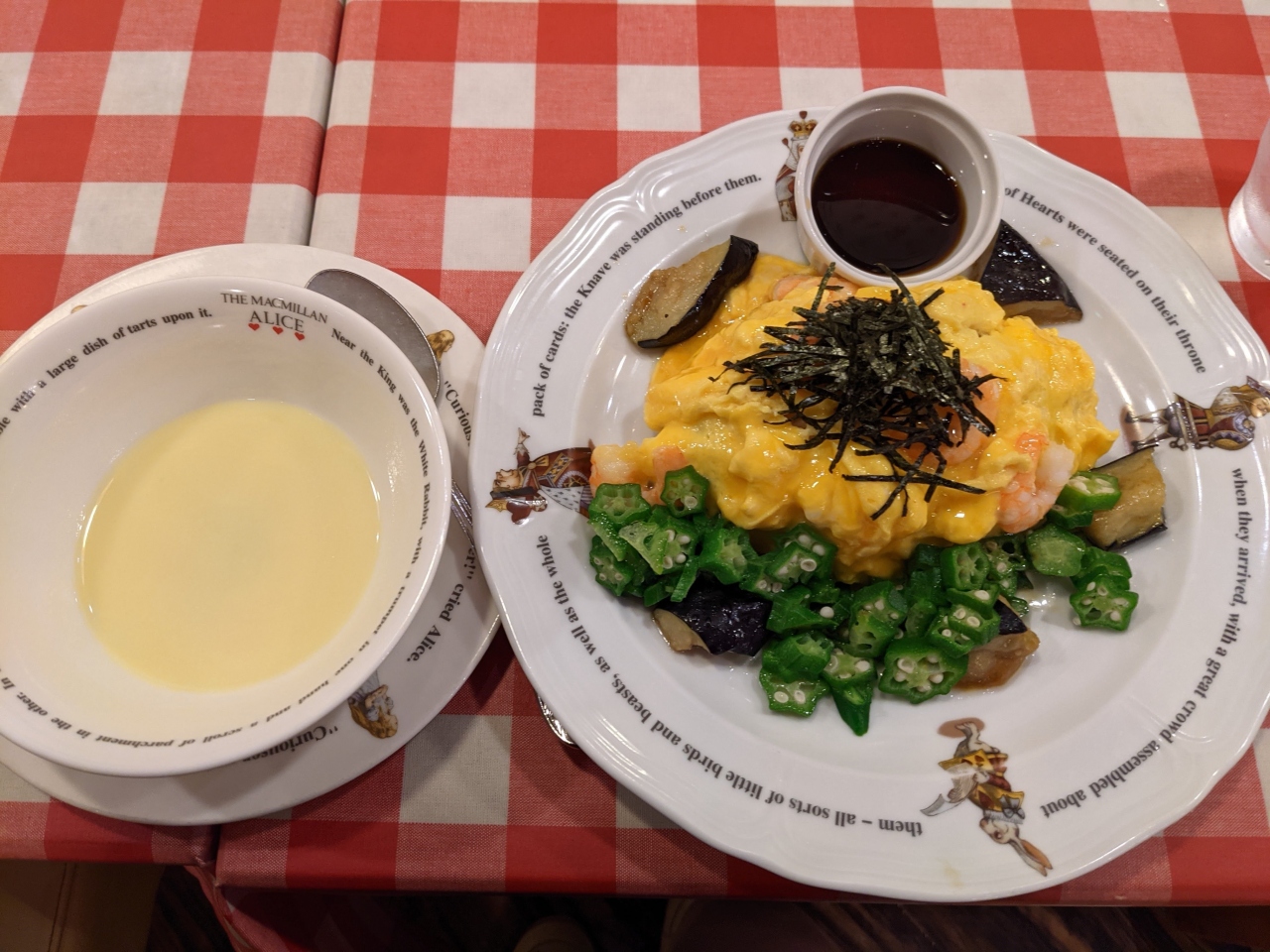 品物の名前は忘れてしまいましたが、可愛らしいピーターグリーンの食器に、ふわふわトロトロのたまごに包まれた十穀米のオムライスに季節野菜のオクラ、ナスが付け合わせられたものに、ポタージュスープとラケルパンが付いたセットを選びました。