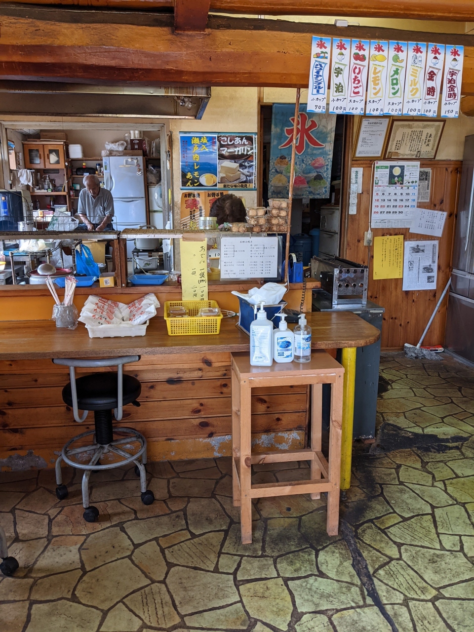 いつもはカウンターの棚に焼きたてのお好み焼きや焼きそば、たこ焼き、みたらしだんごなどが並んでいますが、当日は、それらが無くて売り切れてしまっていたので、焼いて貰いました。