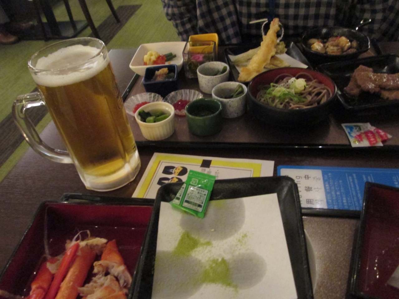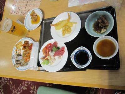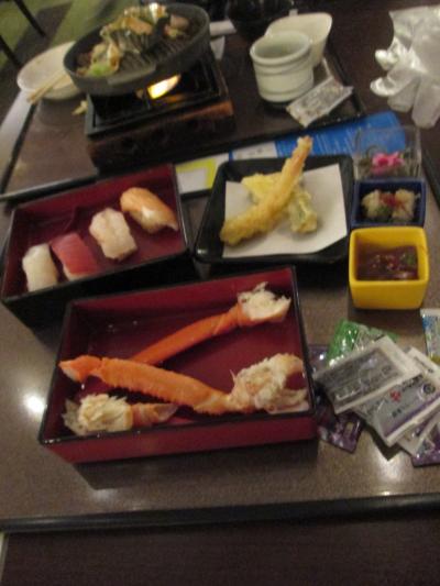 夕食は、冷凍ズワイガニ、にぎり寿司、イカ・鮭等の刺身、天麩羅、とても柔らかった牛ステーキ、ジンギスカンセット等々、多彩なスイーツを含め大満足でした。