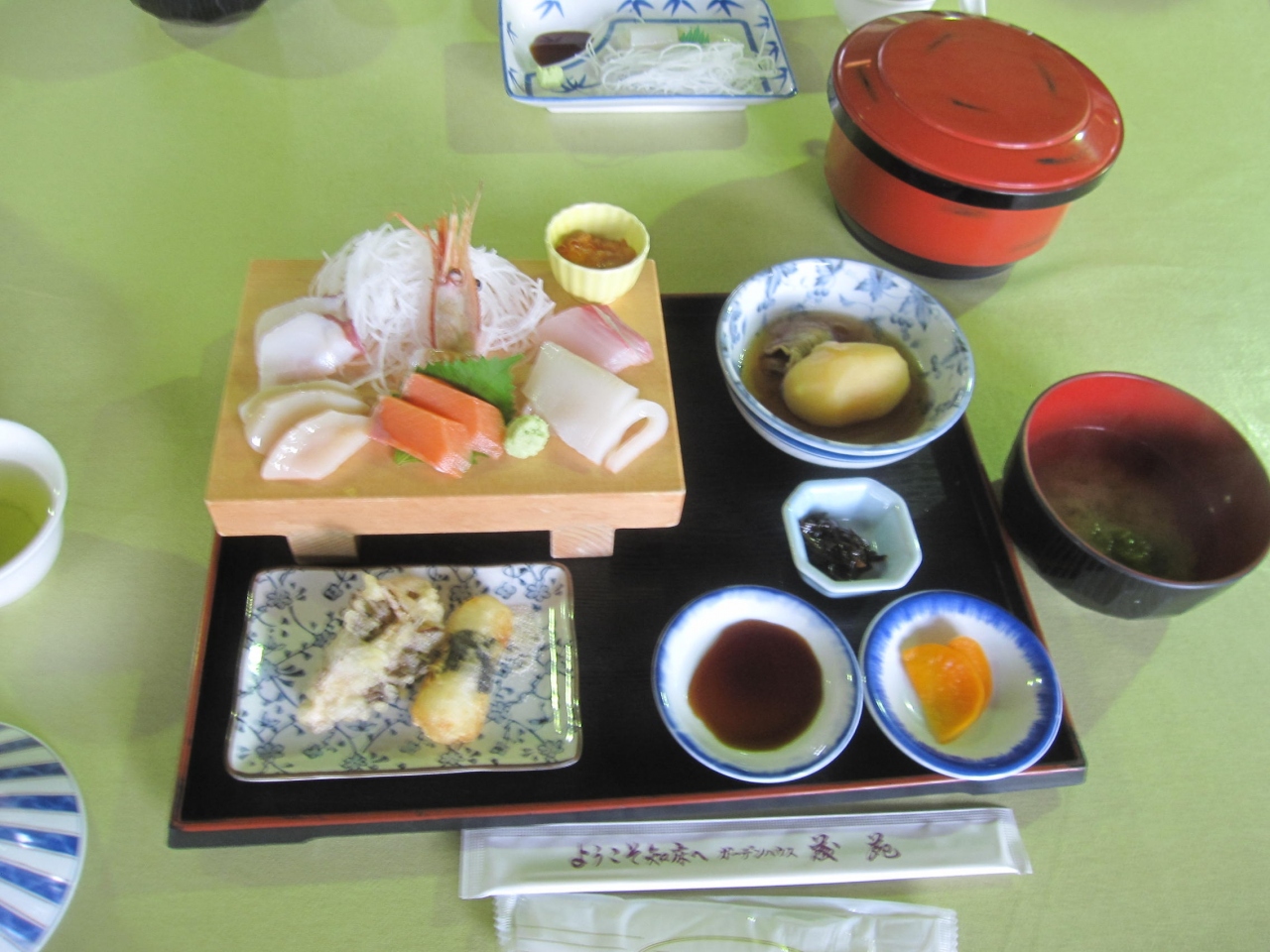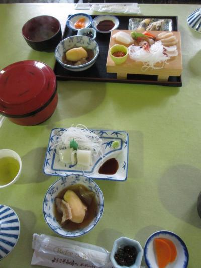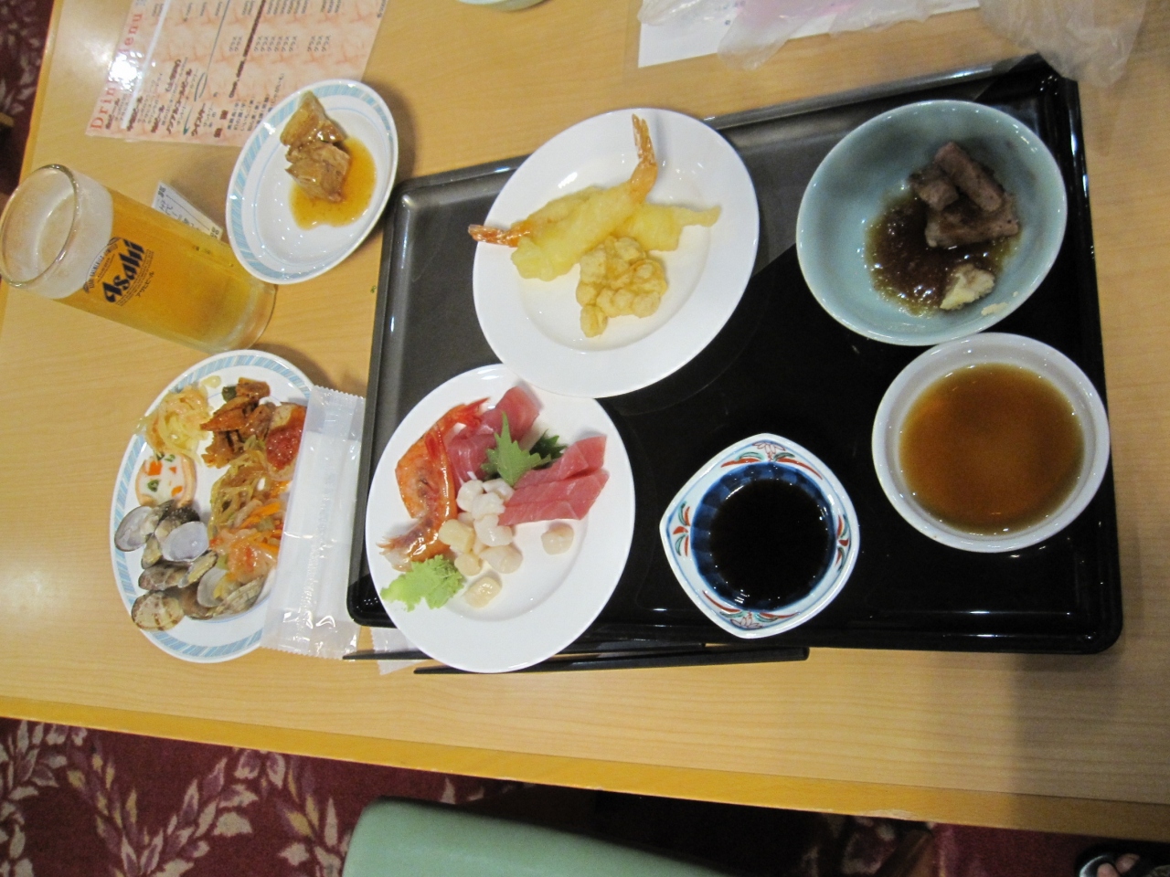 また妻のお刺身定食は、ボタンエビの外、鮭など7点盛りで、山芋などの天麩羅付きでした。- 旅行時期