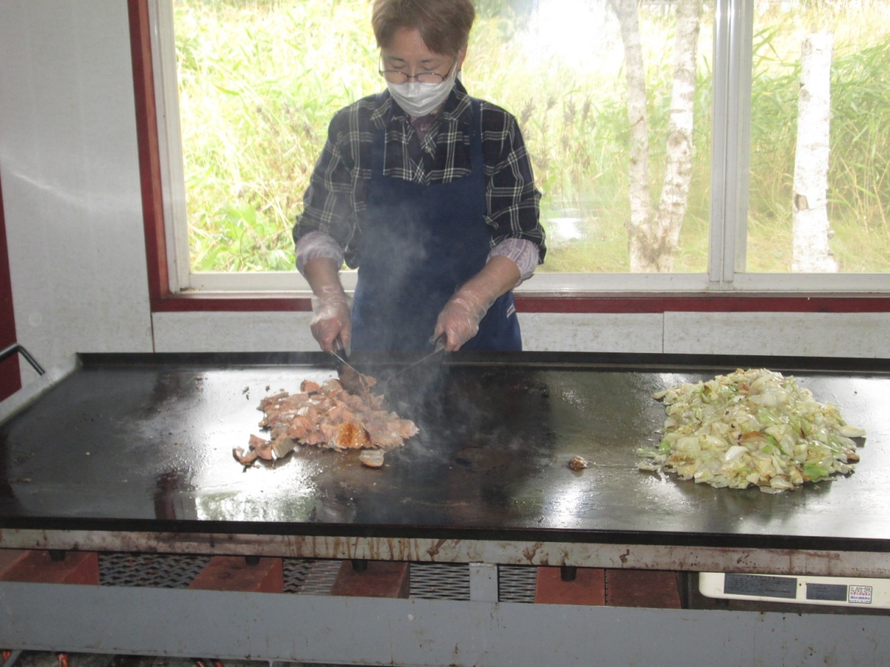 すると客席前の大きな鉄板でキャベツを炒めているお姉さんが、斜里産の鮭を使っていると言いながら、オーダー分のちゃんちゃん焼きを豪快に焼き上げて、皿に盛られて配膳されました。