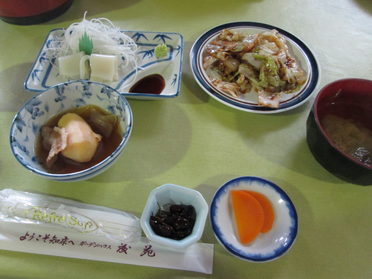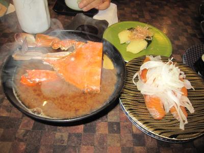 この食堂はまさに団体専用の食堂で、鮭のちゃんちゃん焼きに限りテーブルにはイカ刺定食?と思われるような配膳でした。