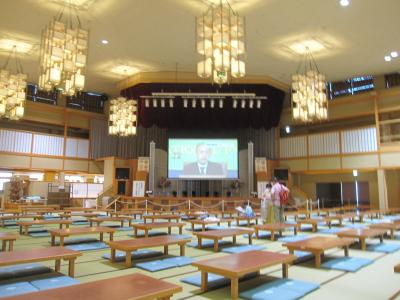 湯あみで入浴後、3階大広間の一番奥にある「桃仙」で、ギョーザとみそこんにゃく、ソフトクリームを購入して、今日の歌謡ショー松村和子さんの「帰ってこいよ」などを聞きながらリラックスしての昼食です。