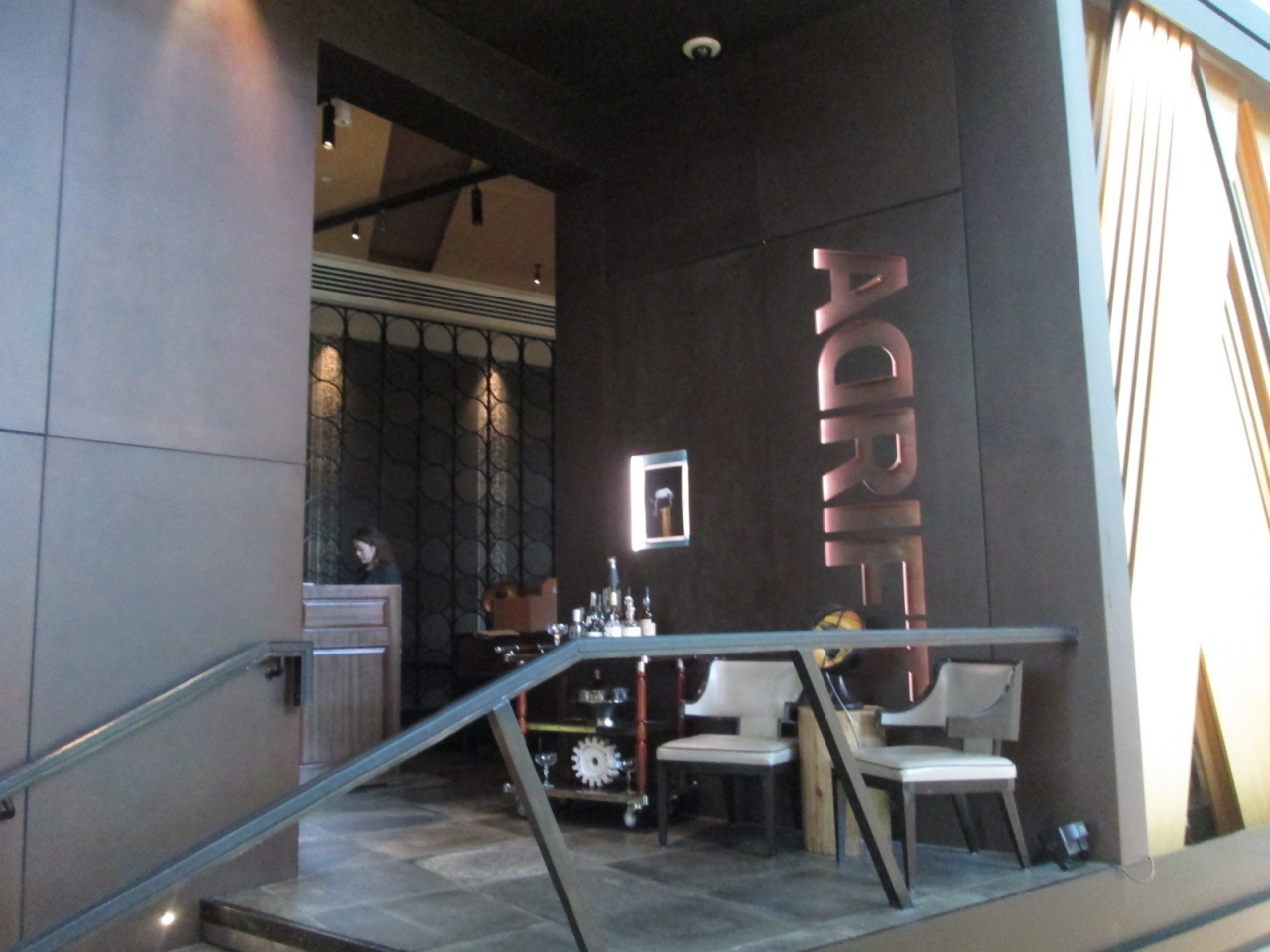 このレストランは宿泊者限定で、夜はバーとして営業しているため、洒落たボトルが飾られた大人の店内。