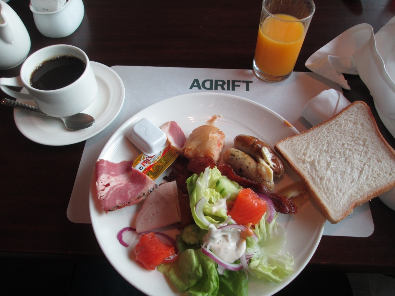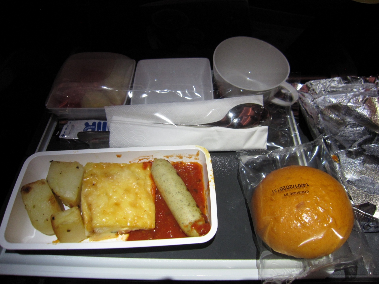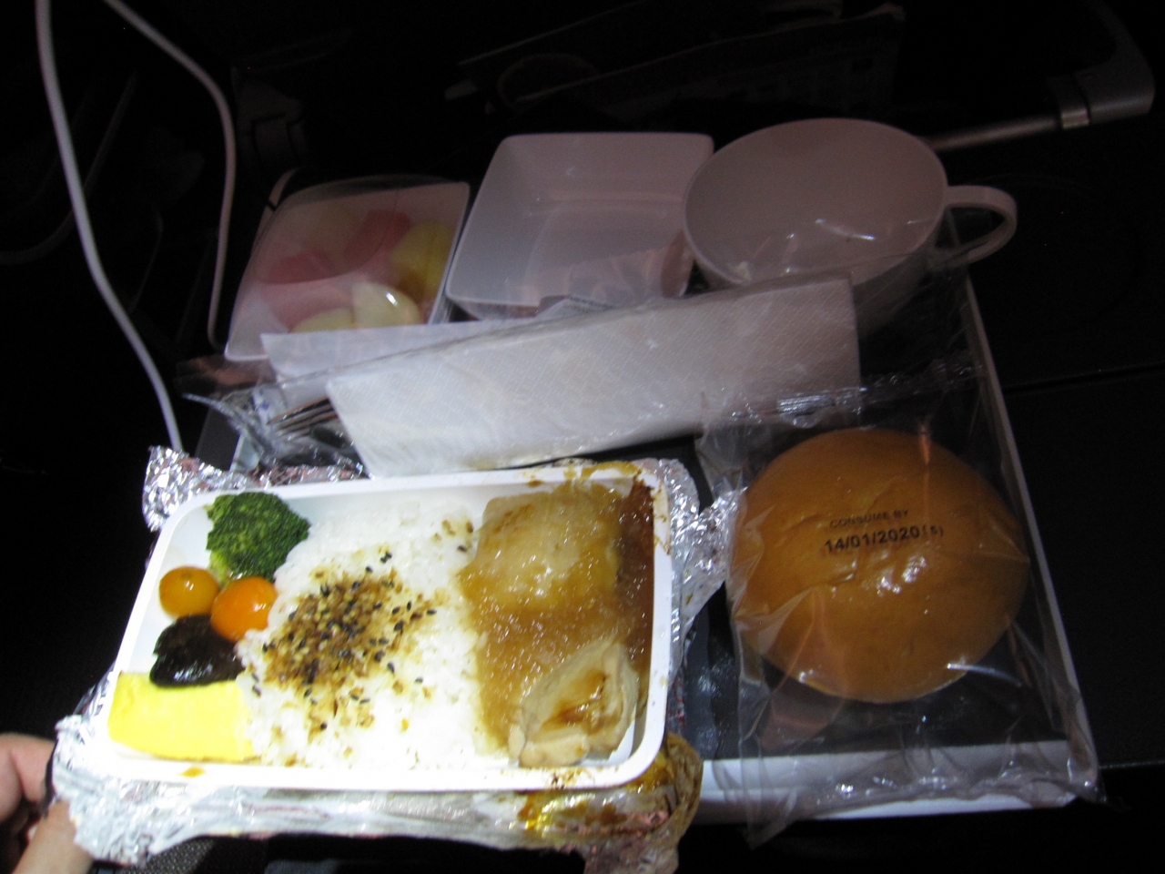 離陸して2時間程過ぎた現地時間の午前4時頃、CAがグッドモーニングと言いながらおしぼりの配布が始まり、その後30分で朝食の配布。