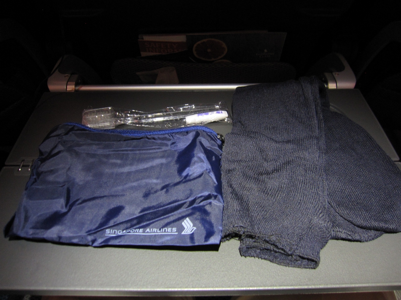 その後、歯ブラシセットと靴下が入ったポーチが配布され、午前1時20分に中部空港に向けて離陸。