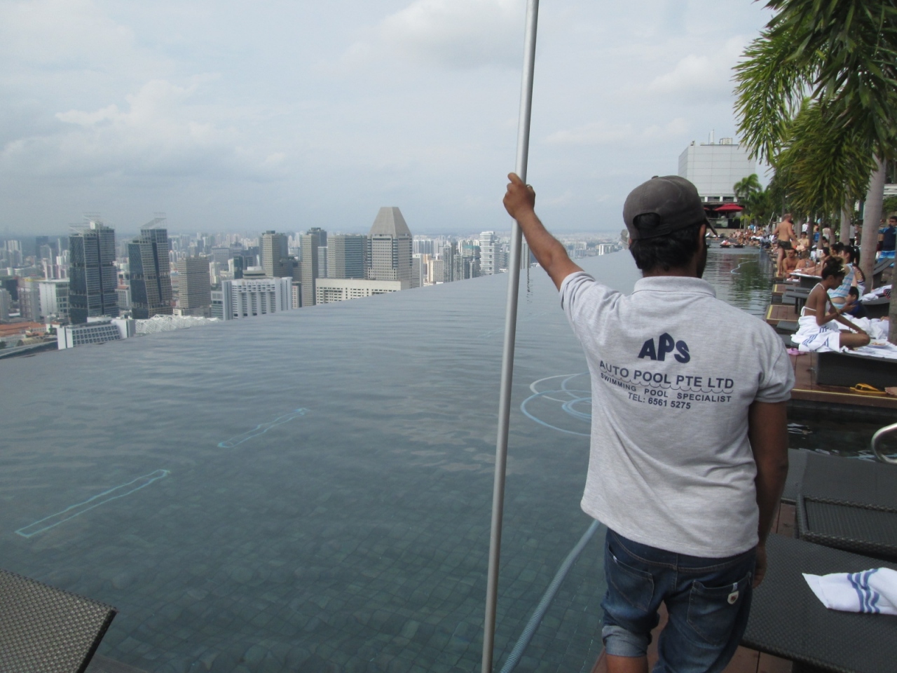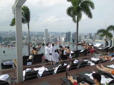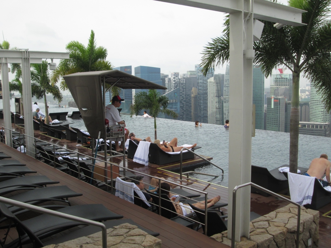 日中のプールは、各国のお客さんで賑わっており、周囲のビル群と水面のキャップが凄すきます。