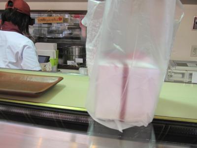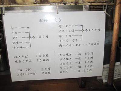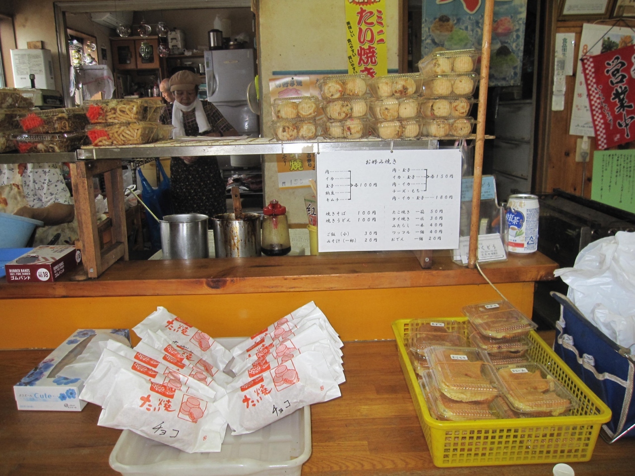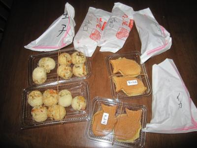 カウンターの棚には、お好み焼き、焼きそば、たこ焼き、たい焼き等が沢山並んでいて、あれこれと取り過ぎてしまったと思ったものの全部で500円でした。