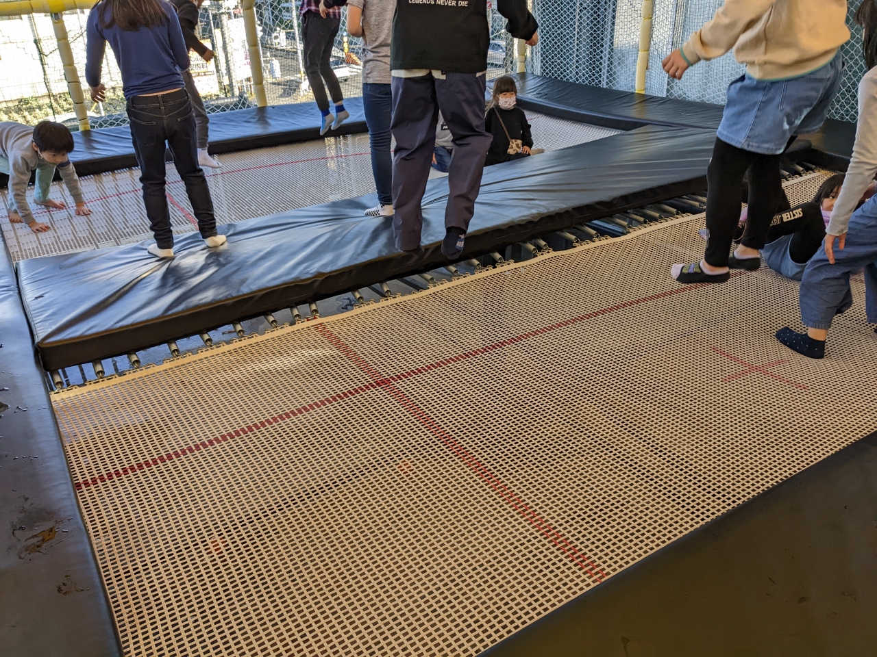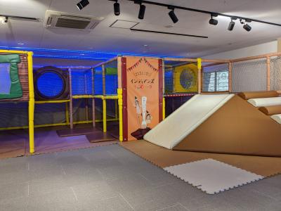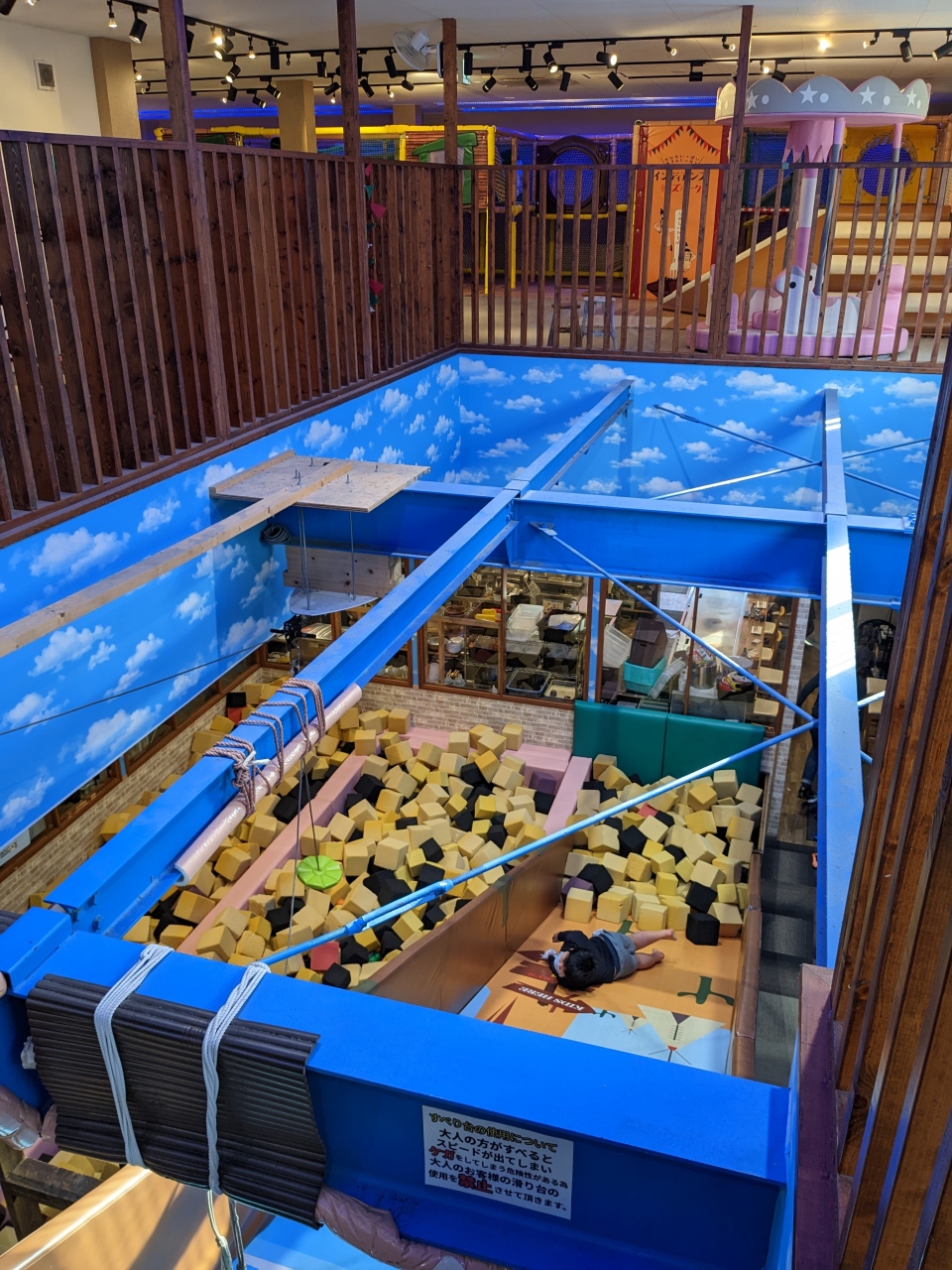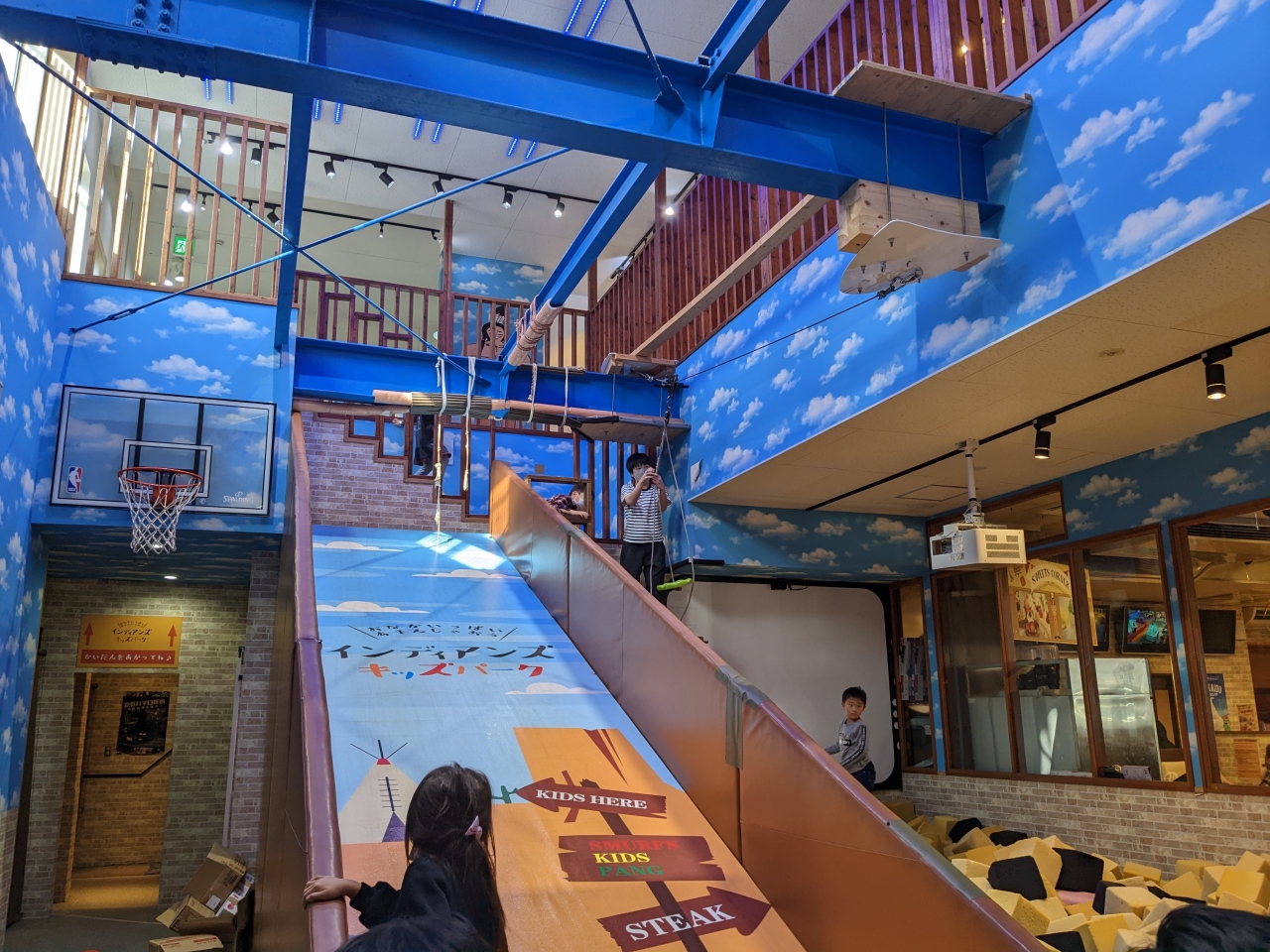 店内に入って驚いたのは、店内の奥がキッズパークになっていて子供達がボールをぶつけあったり、滑り台やロープにぶら下がっては飛び降りたりして大はしゃぎで遊んでました。