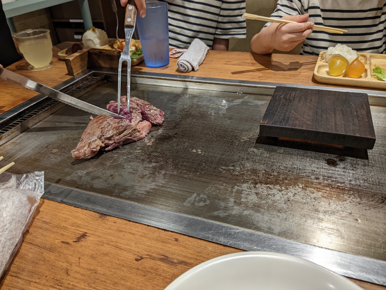 料理は、オーダーした肉が少し焼かれた状態で鉄板に運ばれてきて、それを好みの焼き加減で食べるシステムでした。