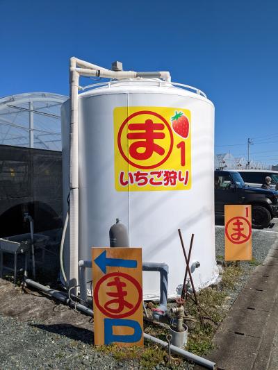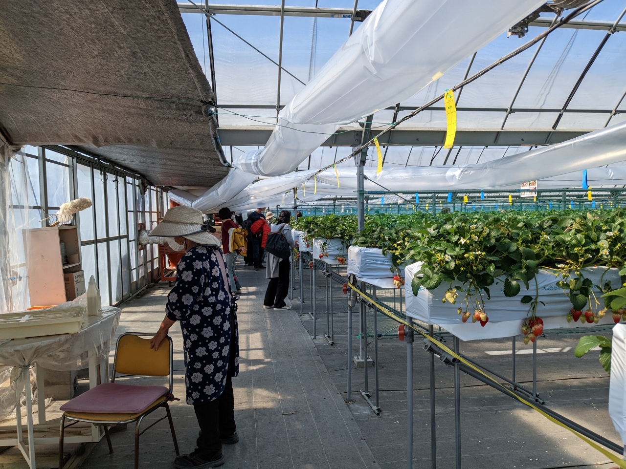いちご狩り施設の前の道路は、駐車場に入るいちご狩りの来客の車がずらりと並んでいました。