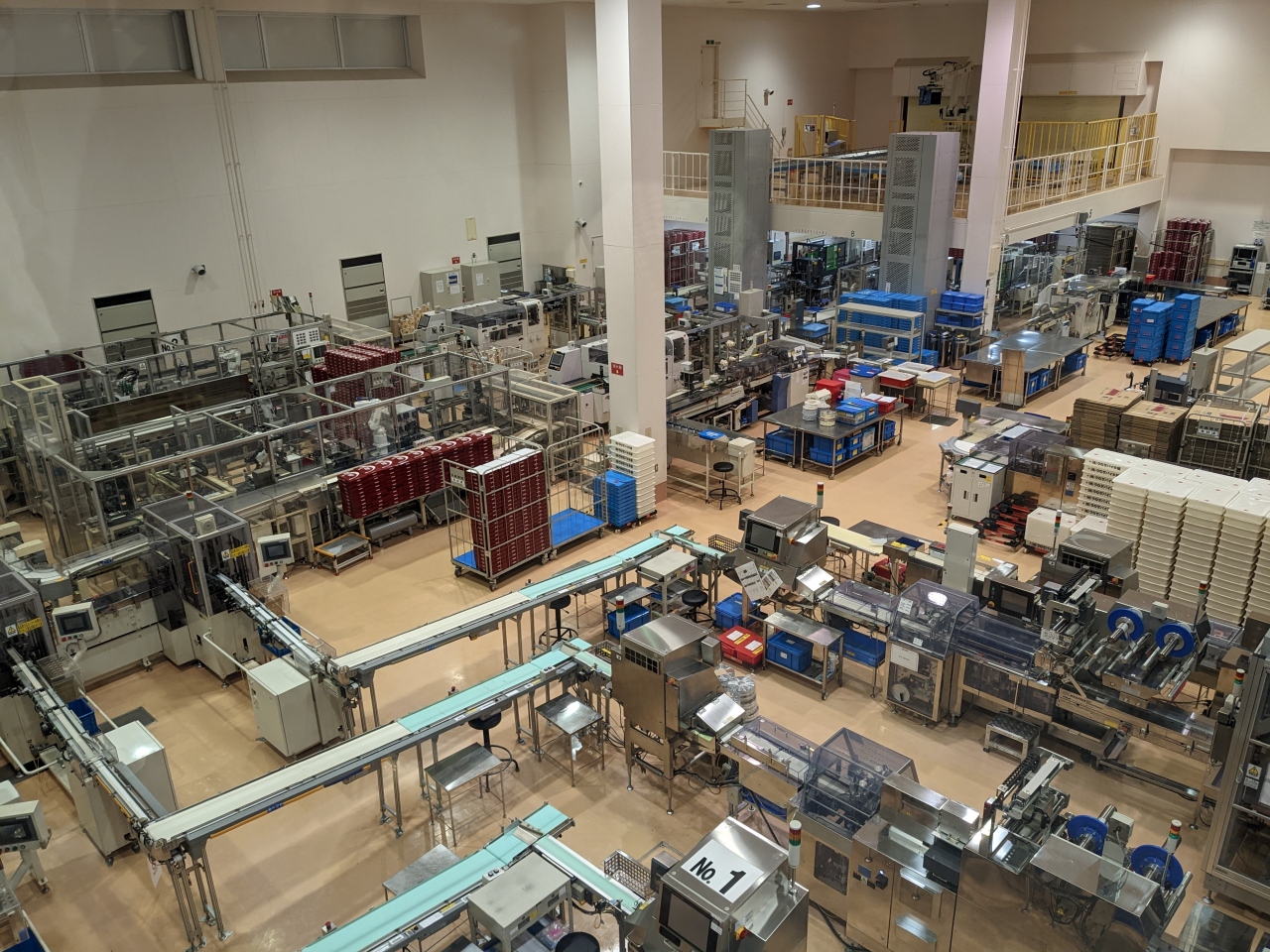 しかし作業場は「本日従業員休日」となっており、2階のガラス越しから見る作業風景の見学は出来ず、整然と機械が並ぶラインの見学のみでした。