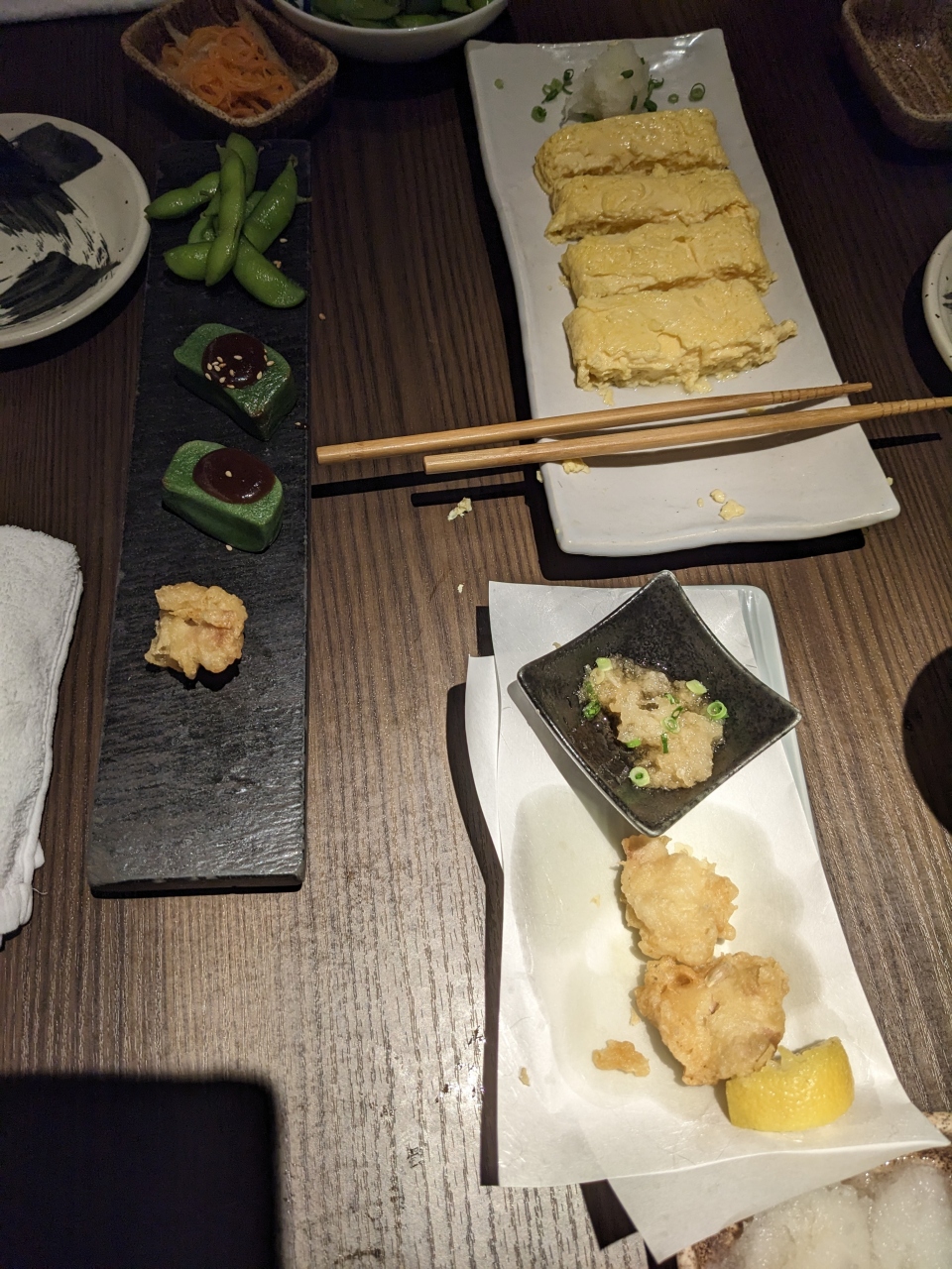頂いた料理は、だし巻き玉子、黒ごま豆富、天麩羅、鱈の西京焼き等。