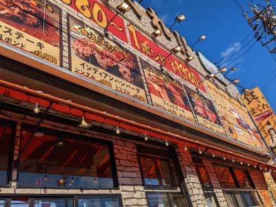 大きくてど派手な看板が目につき、店内に広々とした子供用の遊具が設置されたステーキ屋さん