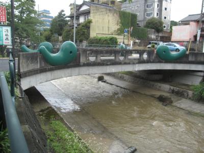 玉造温泉街を流れる玉湯川にかかる橋で、欄干に緑色の大きな勾玉が4つも付いていました。