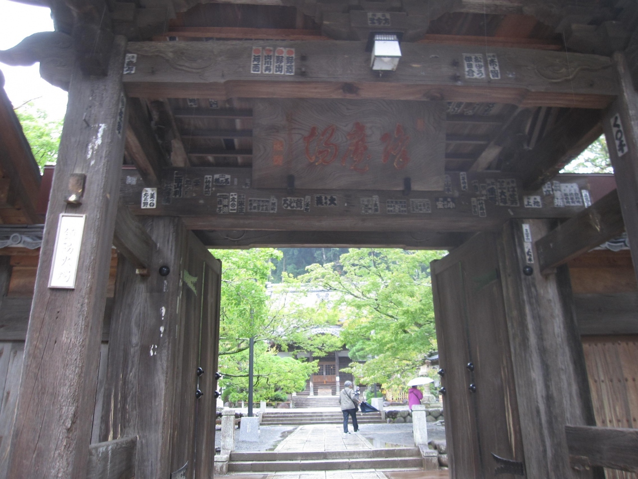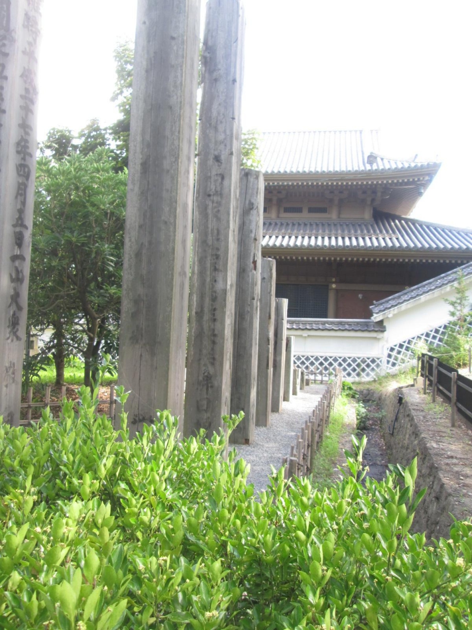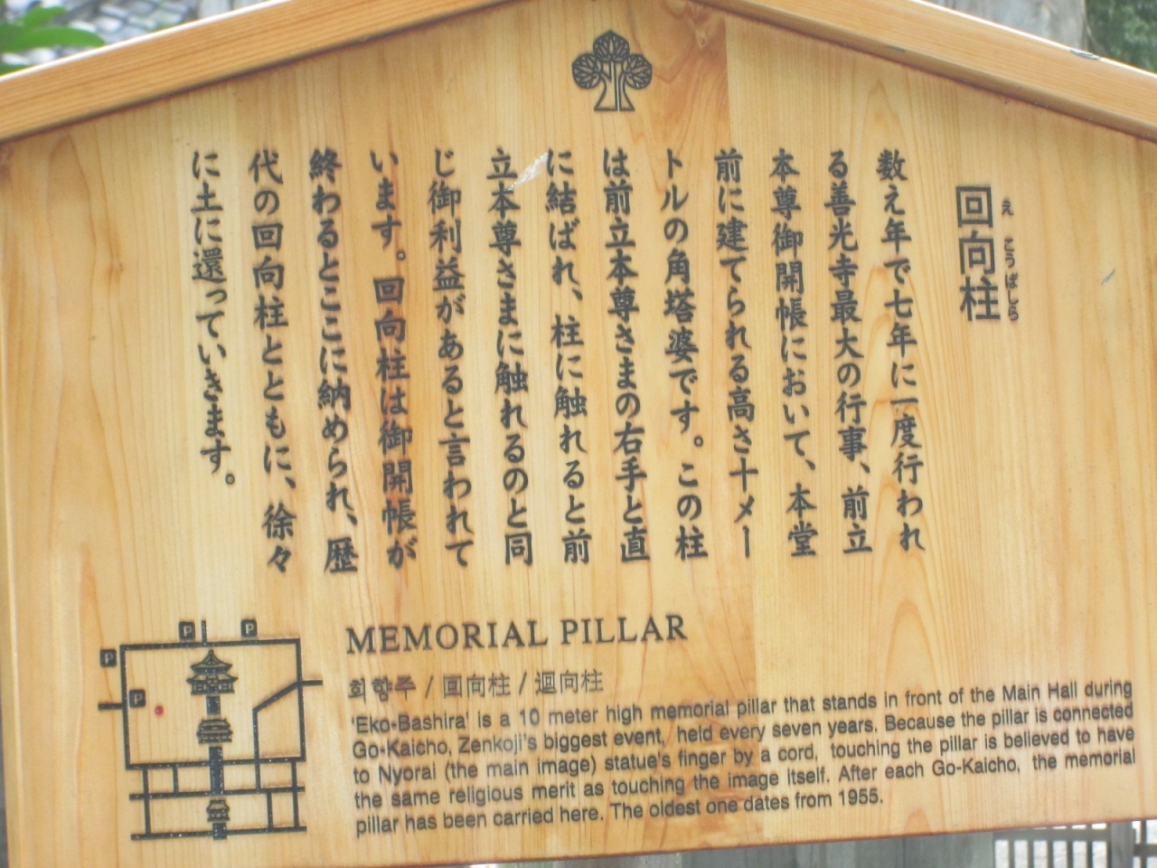 参拝のガイドをして下さる近所のお寺の住職さんと現地の専門ガイドによれば、回向柱は7年に一度行われる御開帳の時に本堂の前に建てられる45㎝角で高さ10メートルの角塔婆で、御開帳期間が過ぎた後は、いずれは土に還すためにこの場所に置かれているそうです。