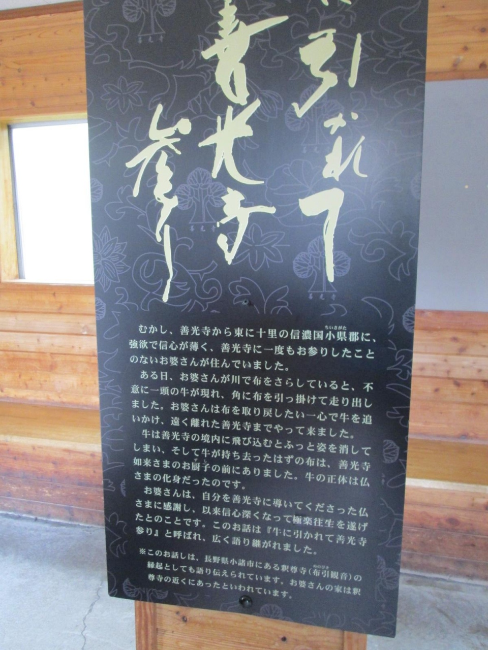 言葉の由来は、昔々信心がなく強欲な老婆が、干しておいた布を角に掛けて走って行く牛を追いかけて善光寺の金堂前に至り、ふと消えた牛が残した文字を見て菩提の心を起こし、