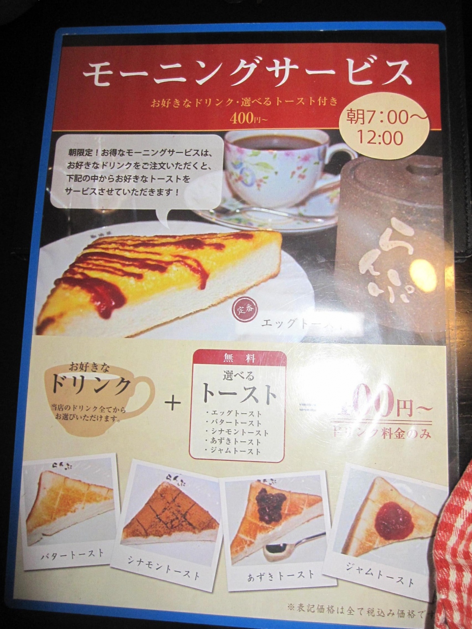 らんぷのモーニングサービスは、好きなドリンクに、5種の選べるトーストを付けて400円で頂けます。