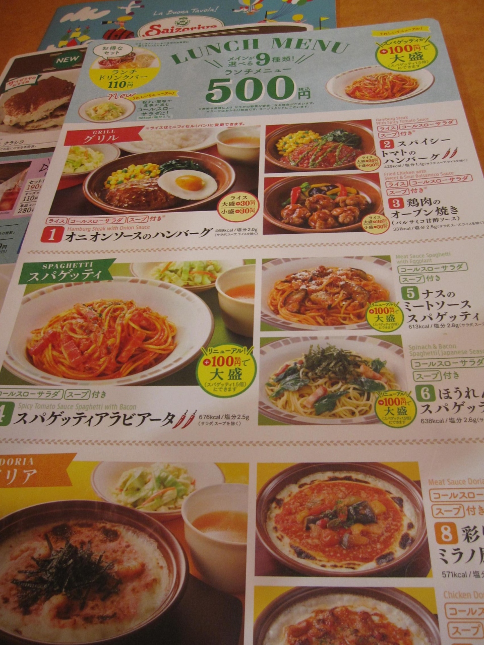 ランチはメインメニューの3種のグリル・3種のスパゲッティ・3種のドリアから選び、スープとライスかパンが付きました。