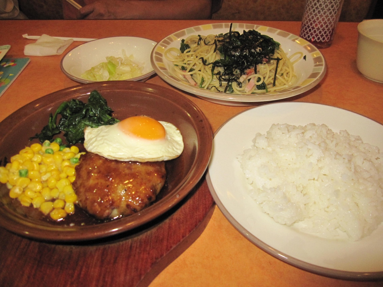 私は、オニオンソースのハンバーグ、家内はほうれん草スパゲッティ。
