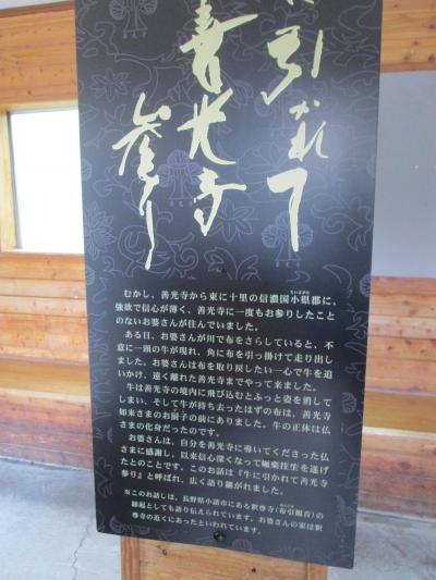 牛の銅像は、江戸時代後期の浮世絵に添えられた「牛に引かれて善光寺参り」と題する絵がルーツとか。