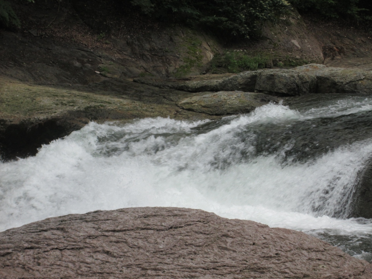 渓谷の遊歩道は湿っていて、足が滑りやすいので注意しながら歩くと、岩盤の割れ目に向かって水が流れ落ちていくのが見えて来ました。