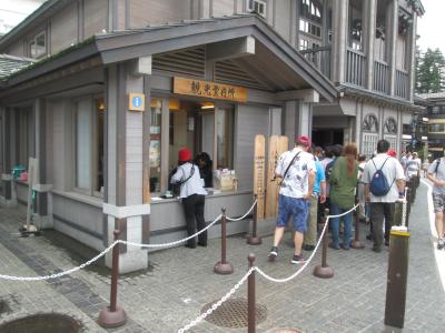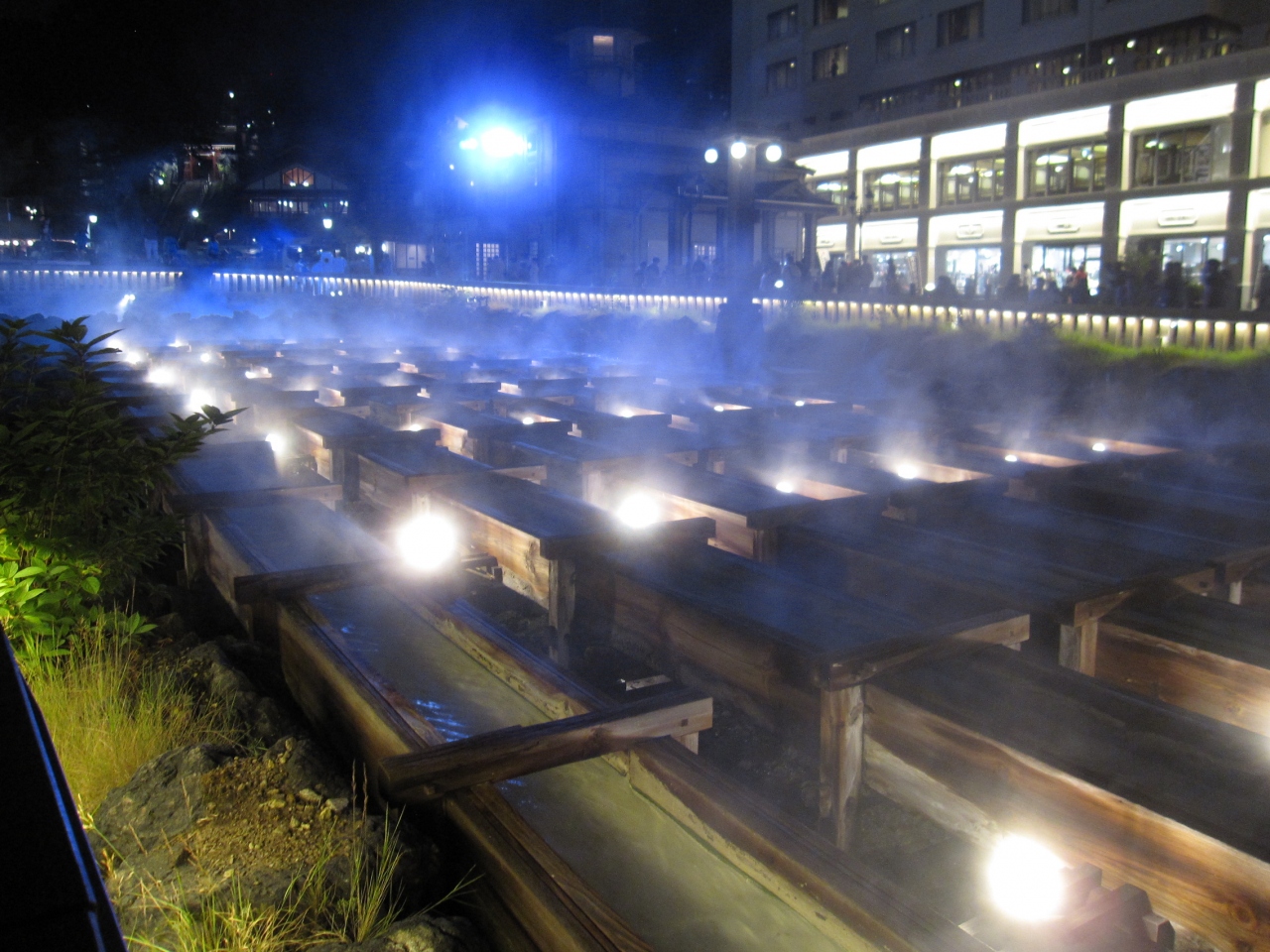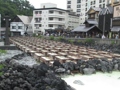 整然と並んだ湯の花を沈殿させておく湯畑の周りは、瓦を敷きつめた歩道となっており、滝湯や足湯の「湯けむり亭」等を見学しながら一周して来ました。