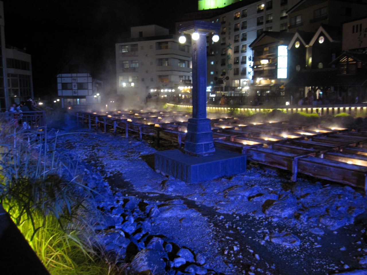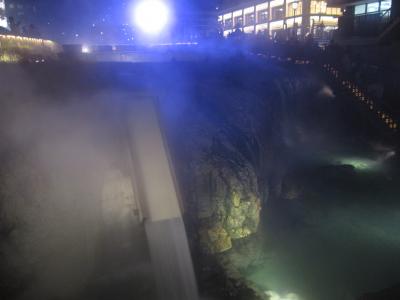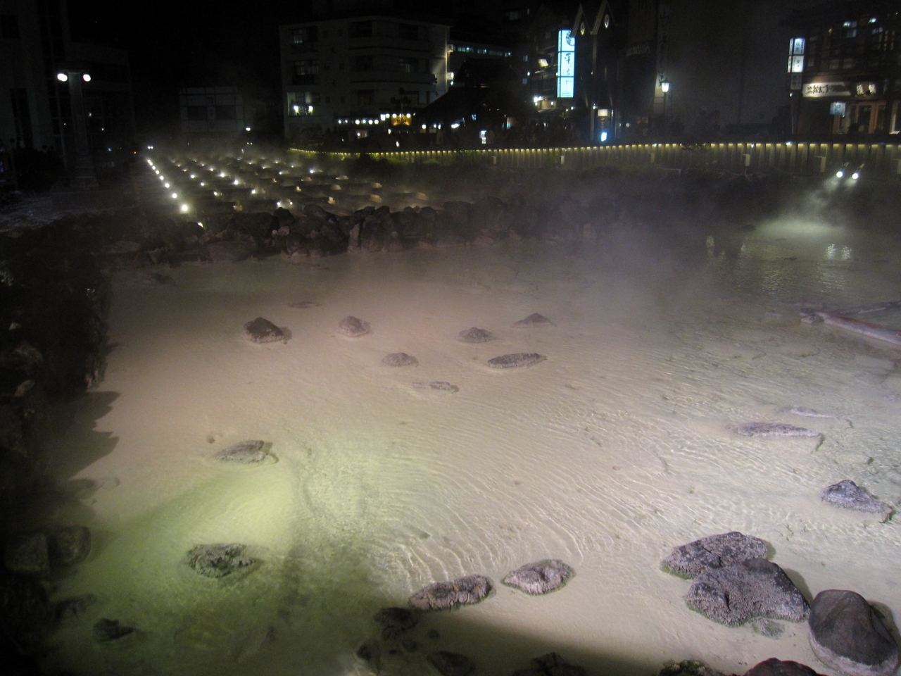 硫黄の匂いが漂い、舞い上がる湯けむりがライトアップされ、すごく幻想的な光景でした。