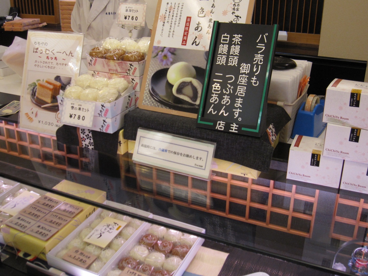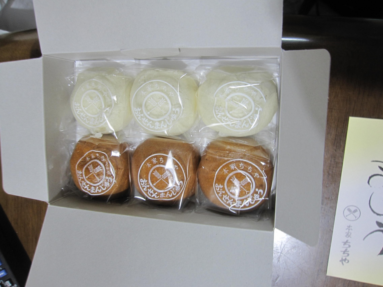 ところが残念、無念、試食はありませんでしたが、予定通り二色あん入りの白饅頭とつぶあん入りの茶色饅頭が3個ずつ入った湯畑セット750円を買いました。